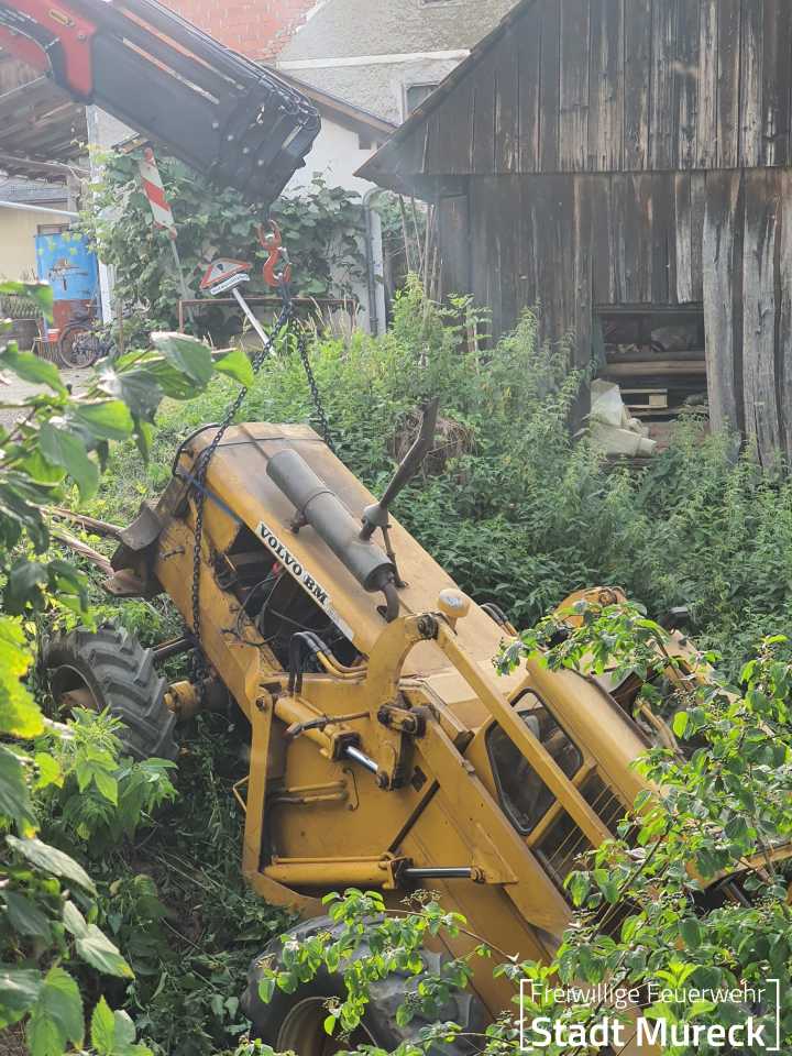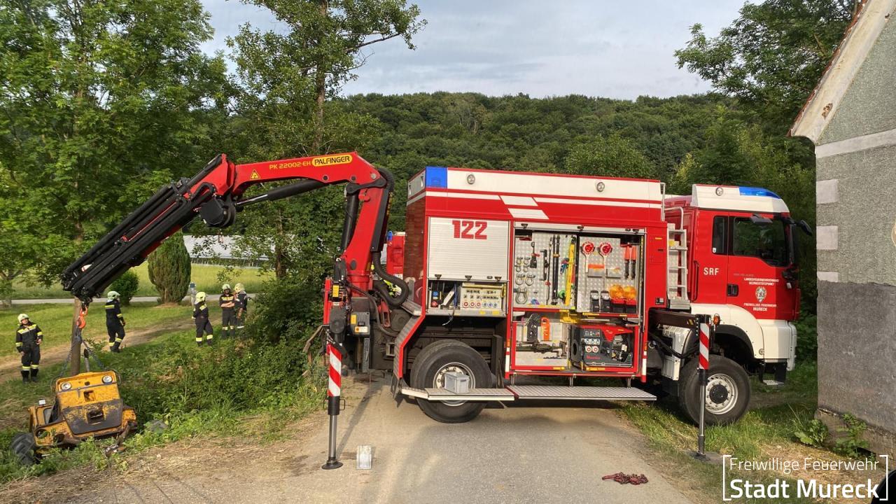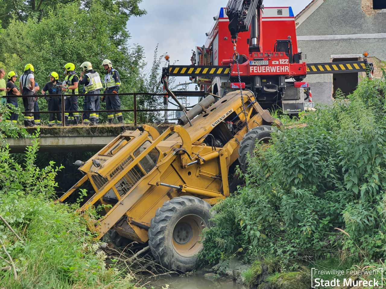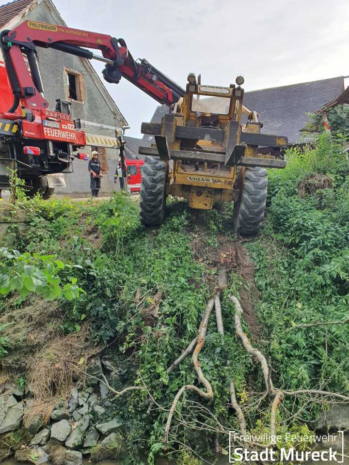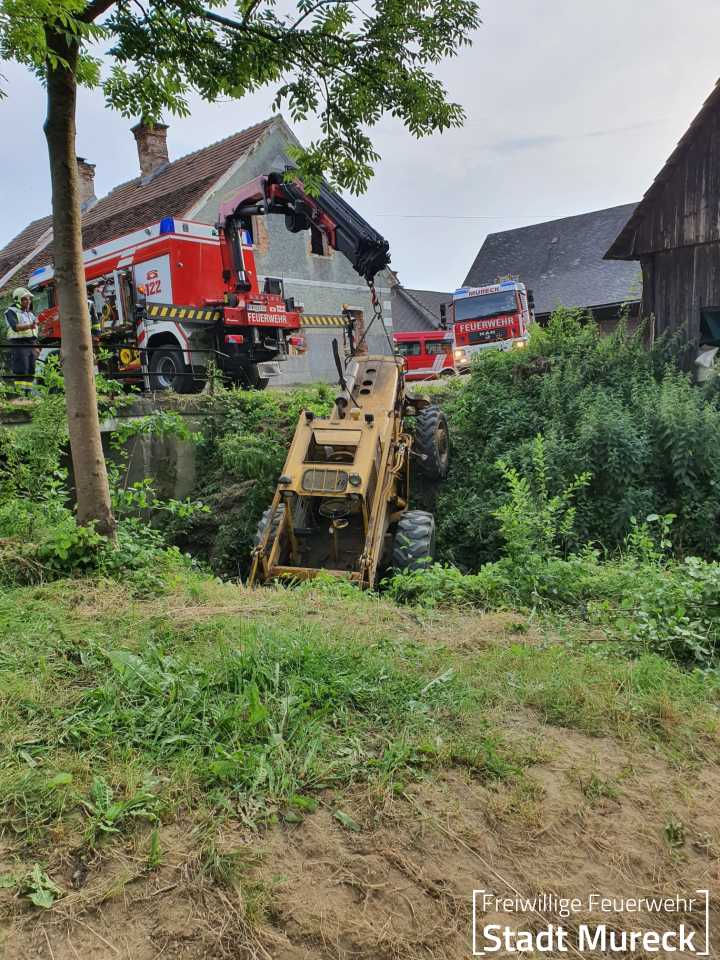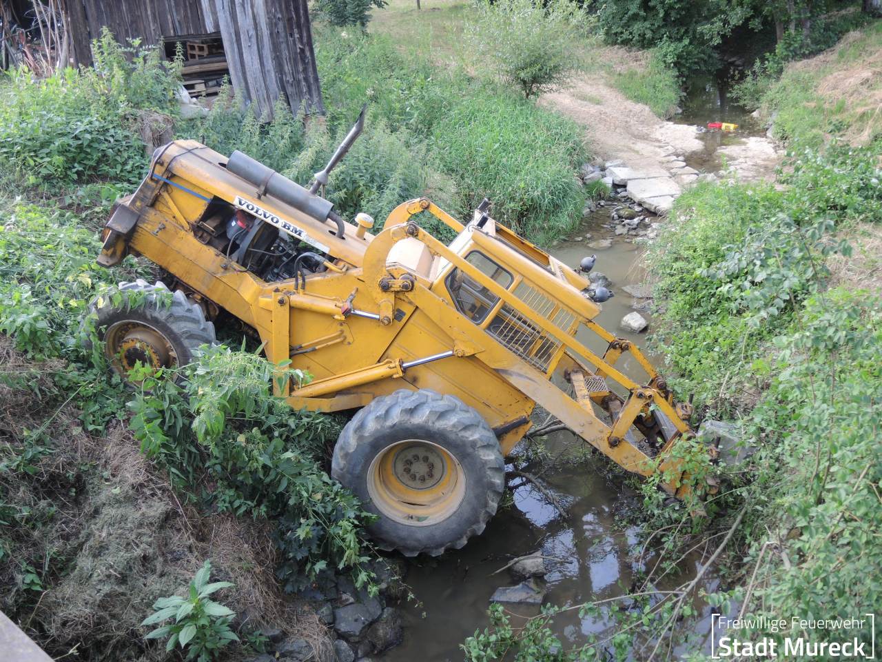 Am Abend des 25. Juni 2024 wurde die Feuerwehr Mureck zu einem aufwändigen technischen Einsatz gerufen. Ein Radlader war über eine Böschung in einen Bach gestürzt.
