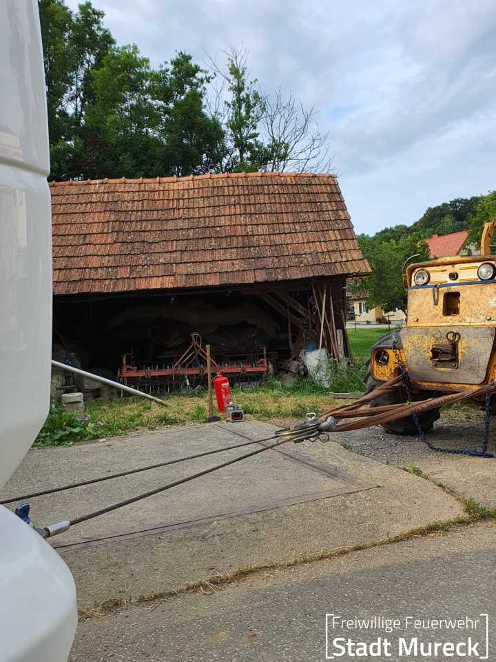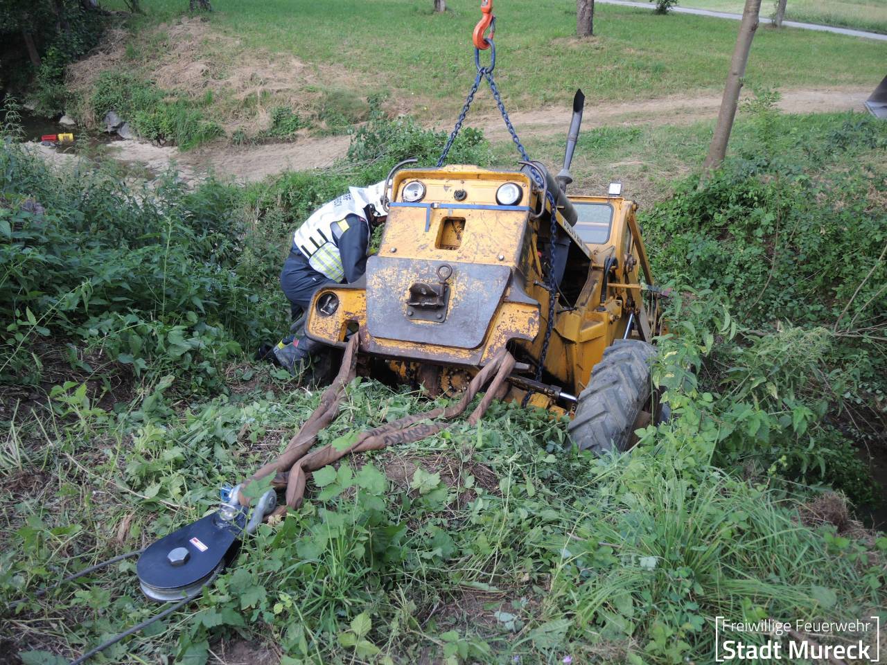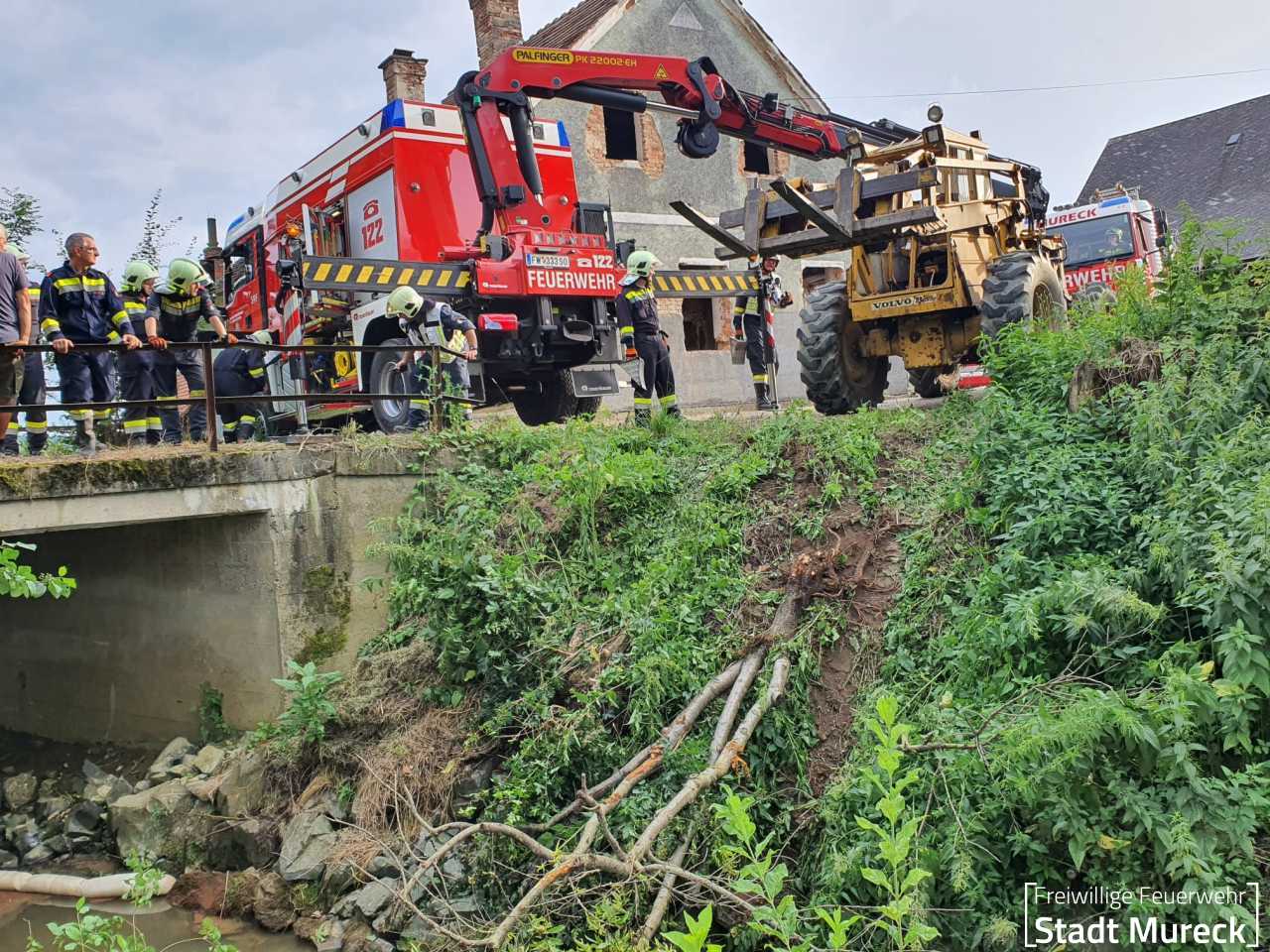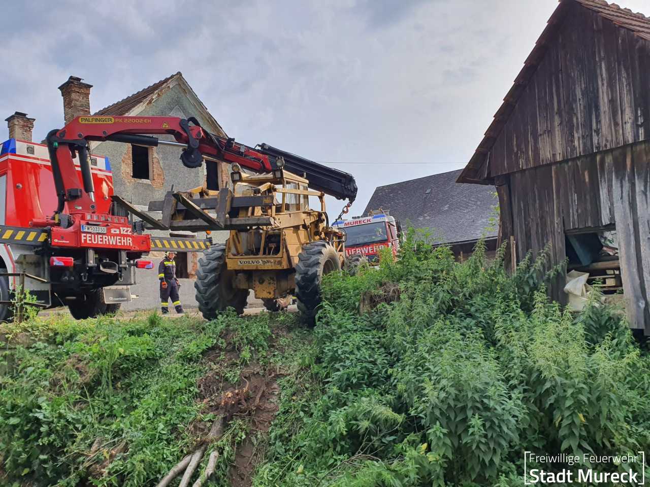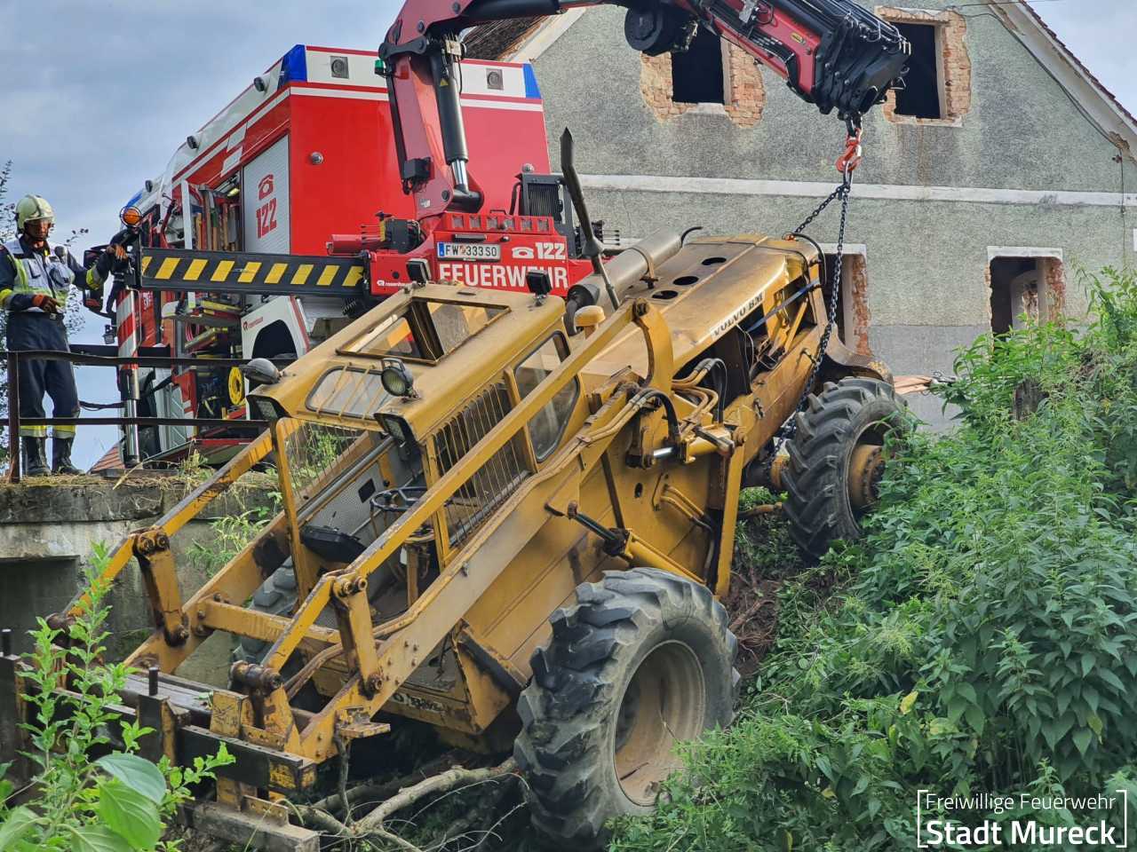 Am Abend des 25. Juni 2024 wurde die Feuerwehr Mureck zu einem aufwändigen technischen Einsatz gerufen. Ein Radlader war über eine Böschung in einen Bach gestürzt.