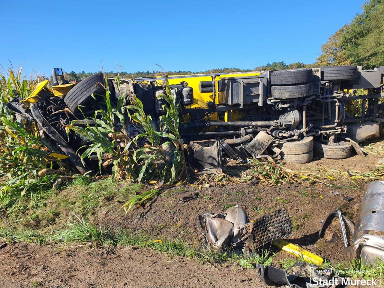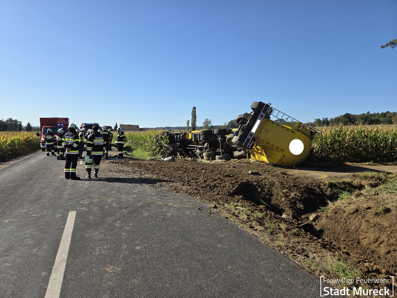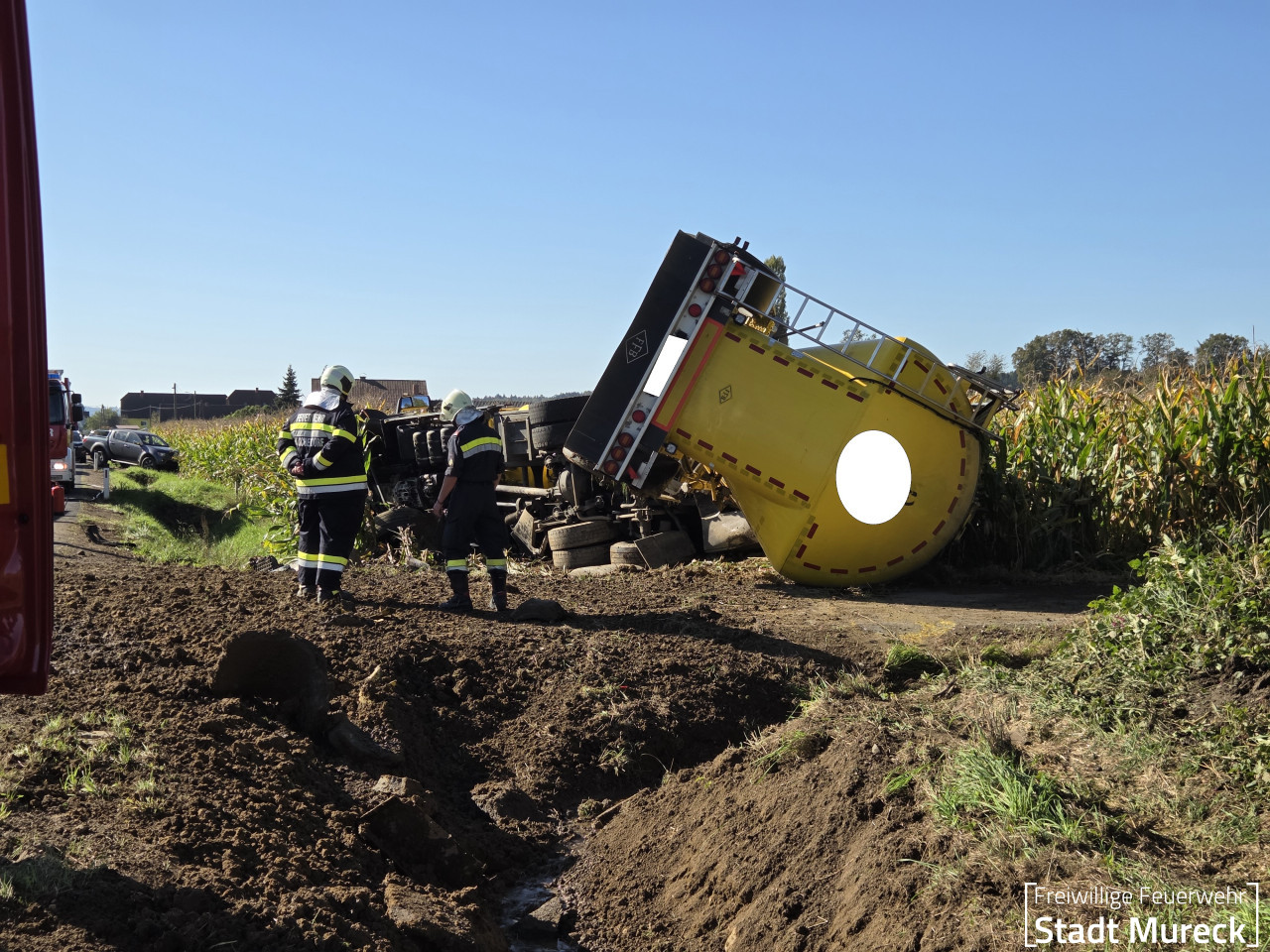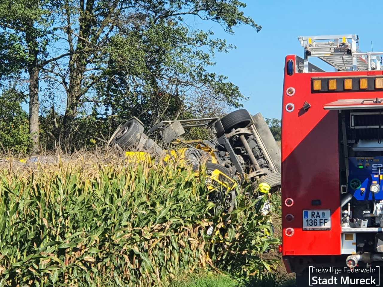 Ein Kraftfahrer war mit seinem LKW-Zug (Anhänger Futtermitteltank) von der Fahrbahn der Landesstraße abgekommen, das Gespann kippte in einem angrenzenden Maisfeld um. Glücklicherweise blieb der Fahrer bei diesem Unfall unverletzt.