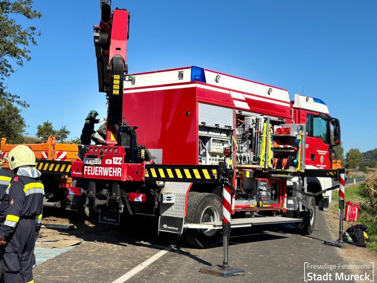 Mit dem Kran des SRF Mureck wurden die Treibstofftanks geborgen und auf einen bereitgestellten LKW zur fachgerechten Entsorgung verladen.