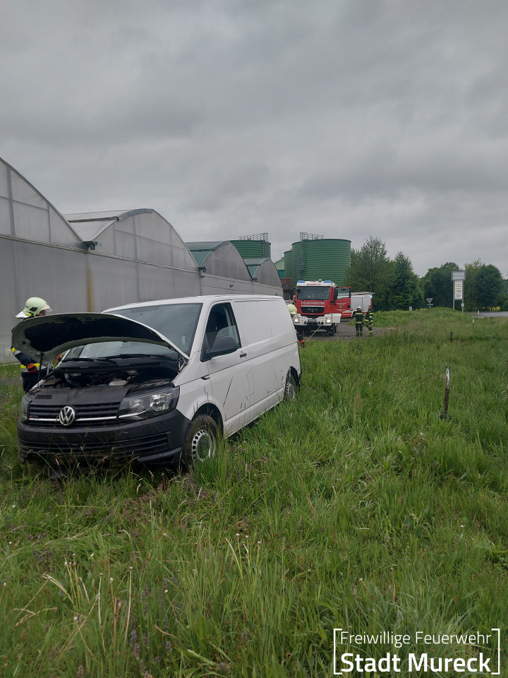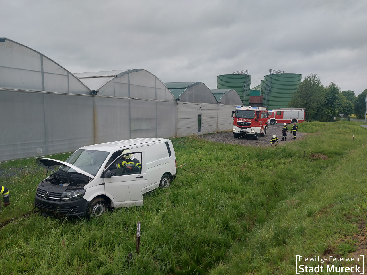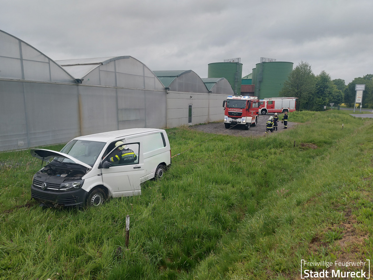 Ein Klein-LKW-Transporter kam bei der Ortsausfahrt von Mureck in Fahrtrichtung Eichfeld von der Fahrbahn ab und auf weichem Untergrund zum Stillstand.