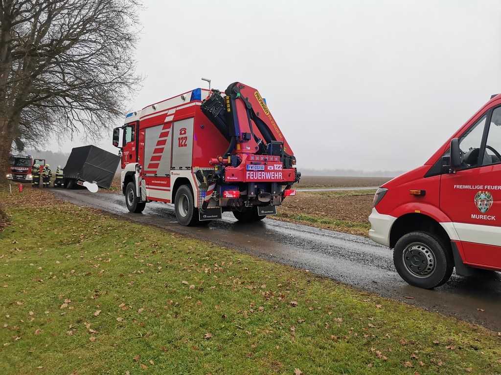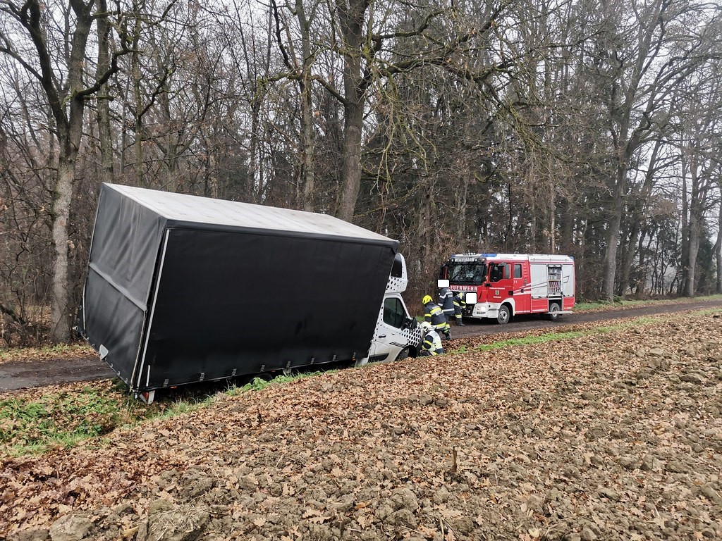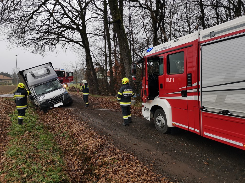 Bergung eines Klein-LKW-Transporters aus dem Straßengraben mittels der Seilwinden des Schweren Rüstfahrzeuges der FF Mureck und des Hilfeleistungsfahrzeuges der FF Weixelbaum.