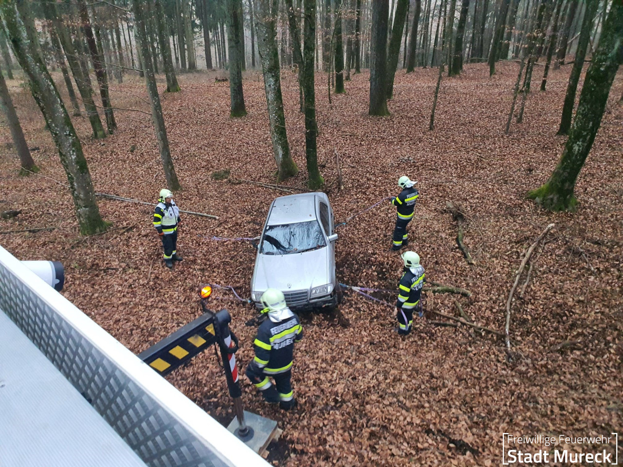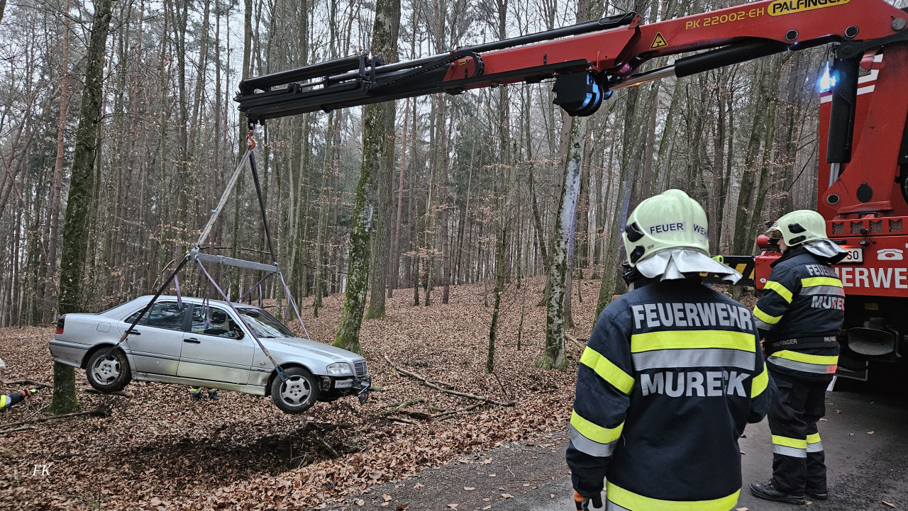 Mit Hilfe des Kranes der Feuerwehr Mureck konnte der PKW, der seine Fahrt selbstständig fortsetzen konnte, geborgen werden.