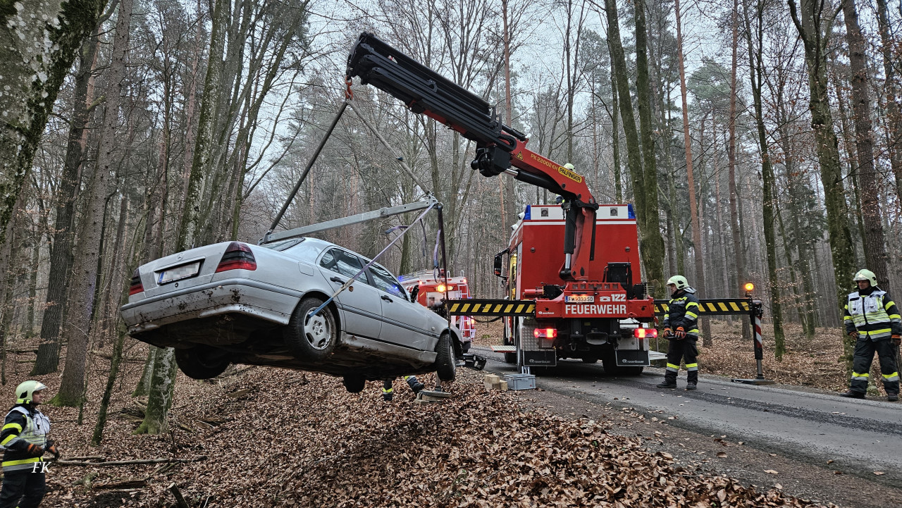 Ein PKW kam am Nachmittag von der Fahrbahn ab und blieb im tiefen Boden hängen. Außerdem war ein kleiner Baum unter dem Auto.