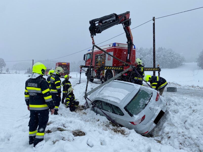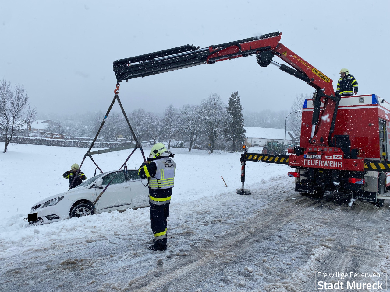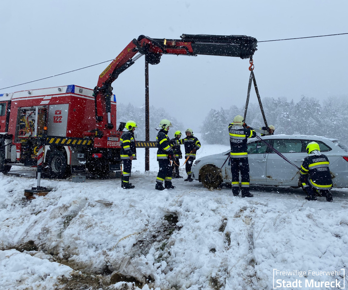 In Zusammenarbeit mit den ortszuständigen Feuerwehren konnten die betroffenen Fahrzeuge mit dem Kran bzw. der Seilwinde des SRF Mureck schonend geborgen werden.