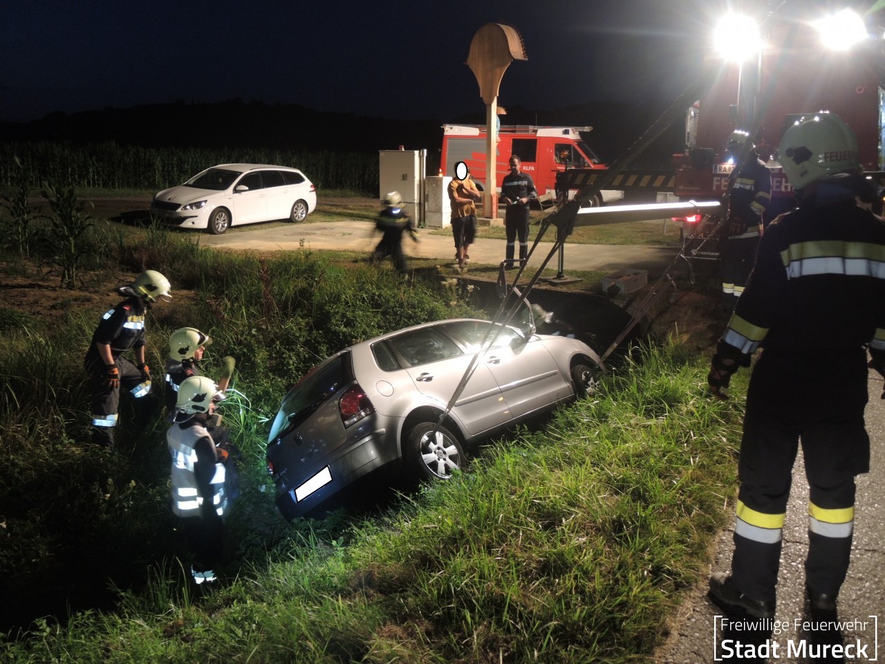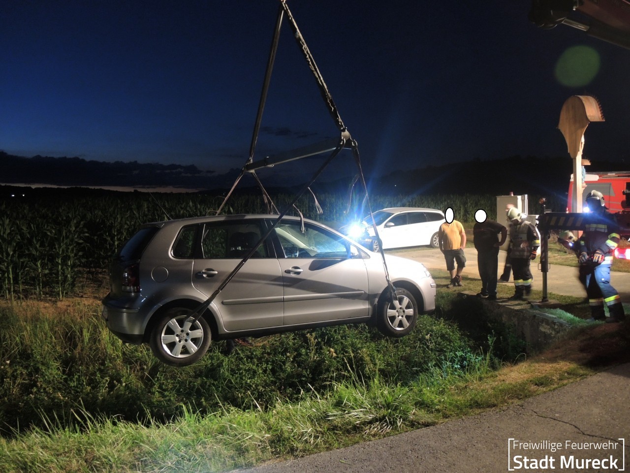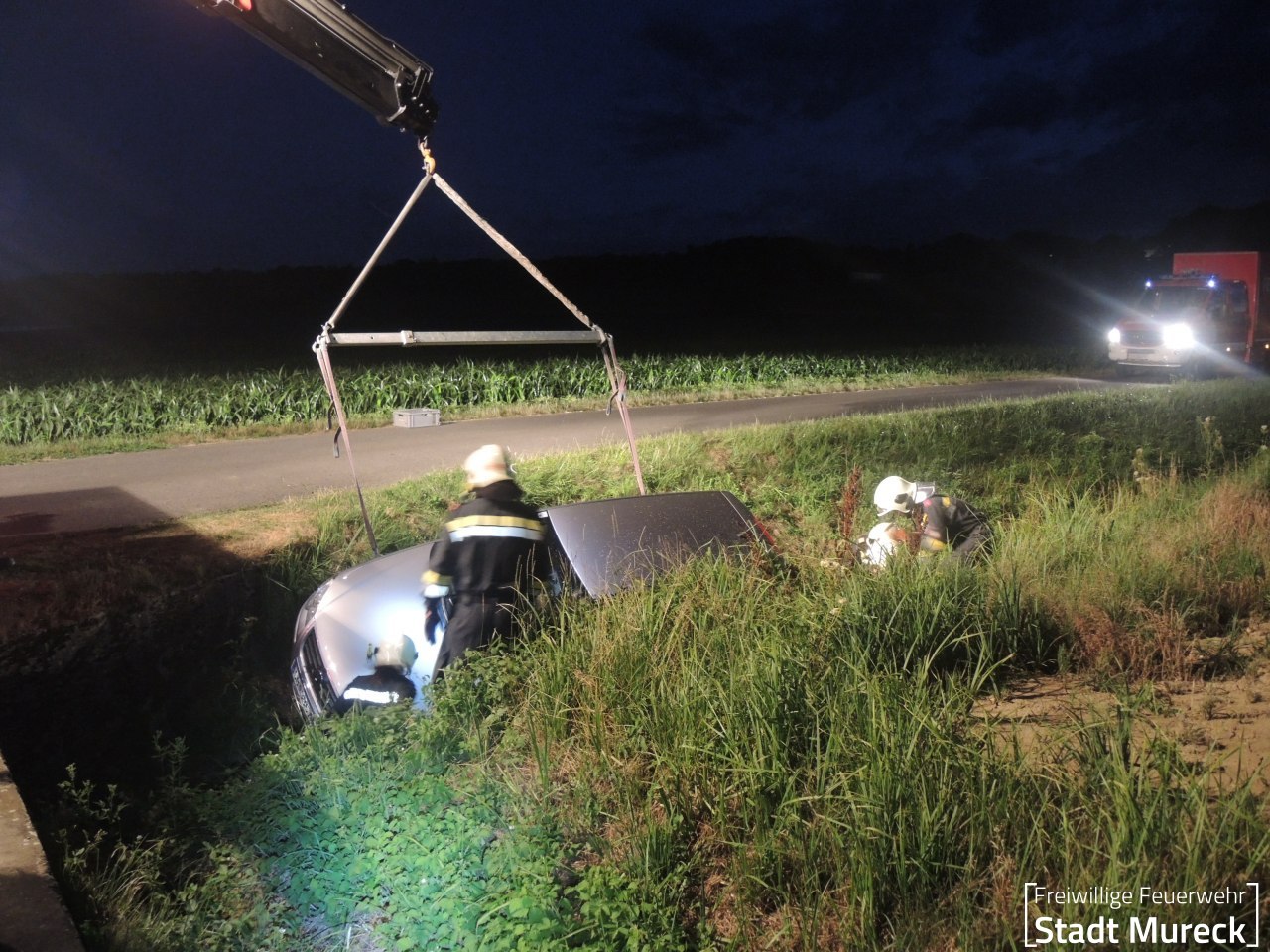 Bergung eines PKW aus dem Straßengraben mittels Kran und Hebetraverse des Schweren Rüstfahrzeuges.