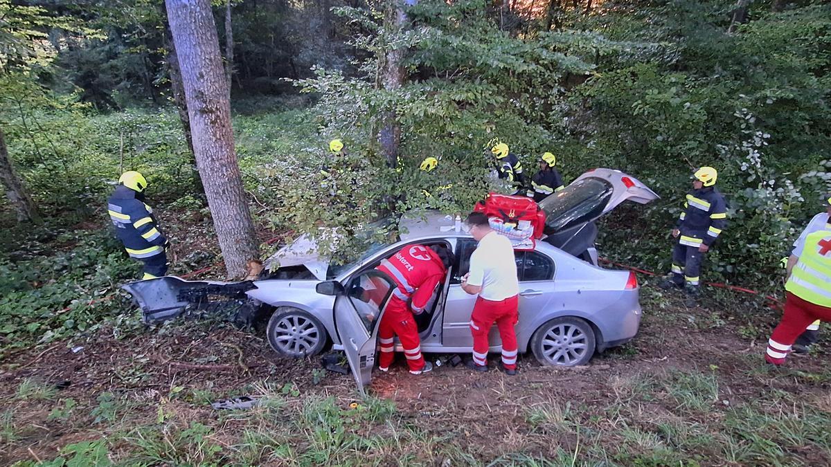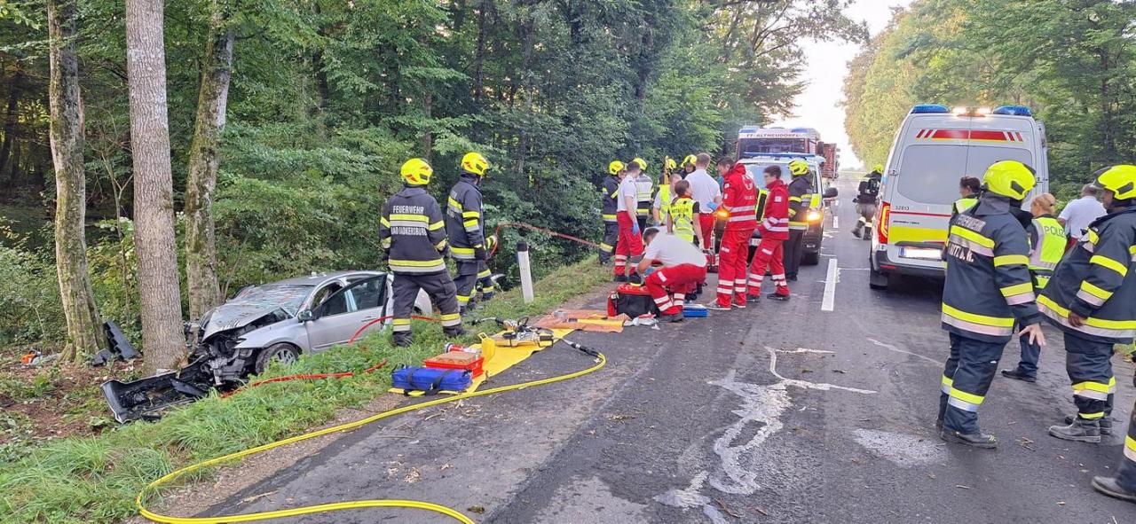 Nach der Erstversorgung durch den Notarzt befreiten Einsatzkräfte der laut Alarmplan alarmierten Feuerwehren Goritz bei Radkersburg, Altneudörfl und Bad Radkersburg die Fahrzeuginsassen in einer aufwändigen Rettungsaktion aus dem schwer beschädigten PKW.