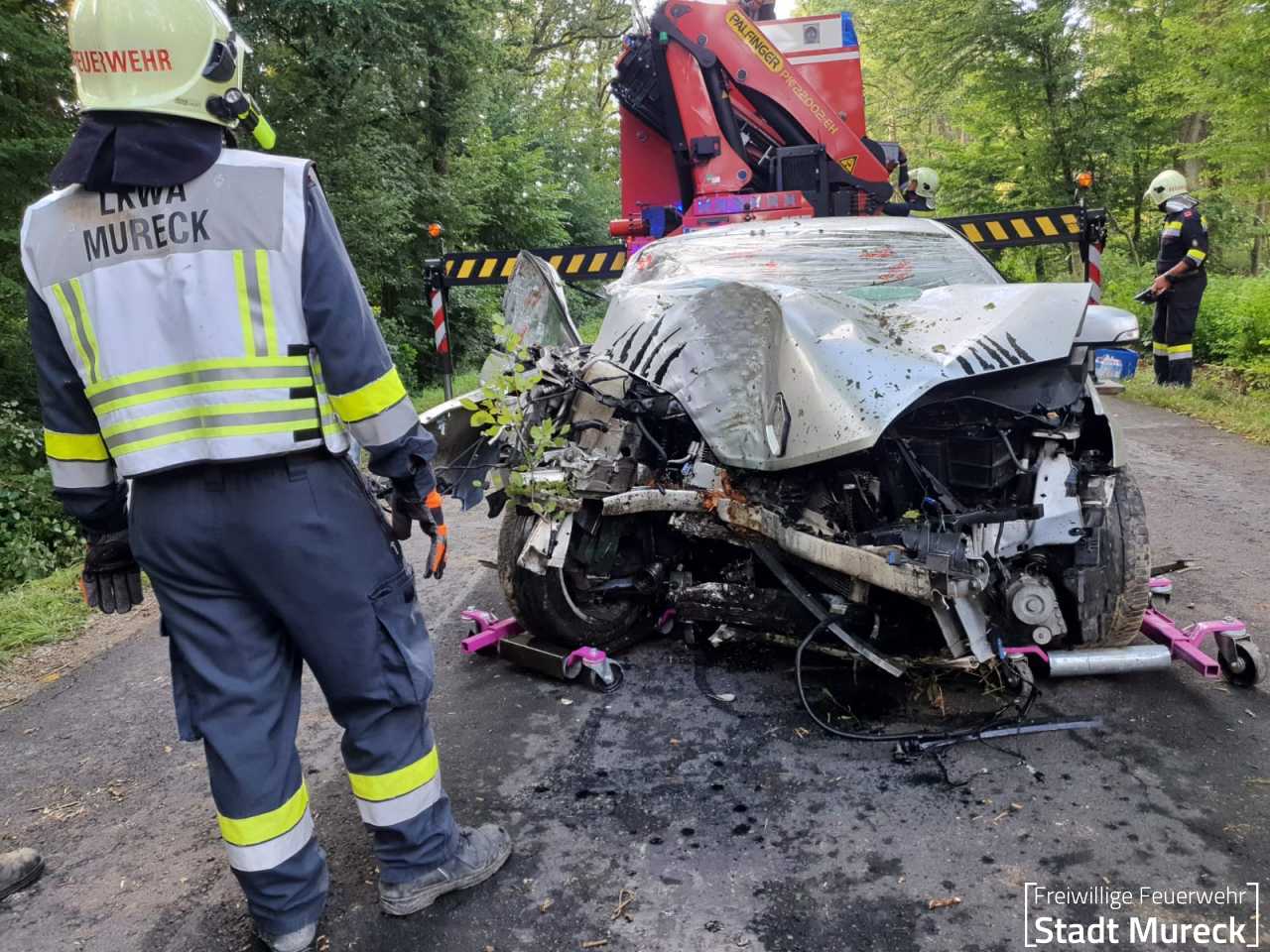 Das Unfallfahrzeug wurde mittels Kran und Hebetraverse des Schweren Rüstfahrzeuges der nachgeforderten Feuerwehr Mureck (Stützpunktfahrzeug für den Feuerwehrbereich Radkersburg) geborgen.