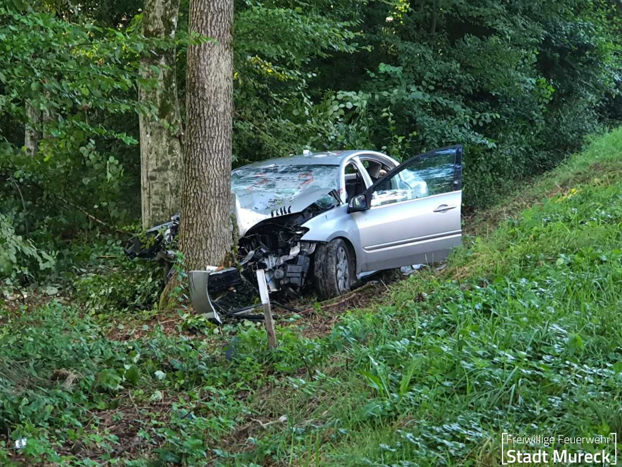 Ein PKW prallte gegen einen Baum, die Fahrzeuglenkerin und ihre Beifahrerin wurden im Fahrzeug eingeklemmt und erlitten Verletzungen unbestimmten Grades.