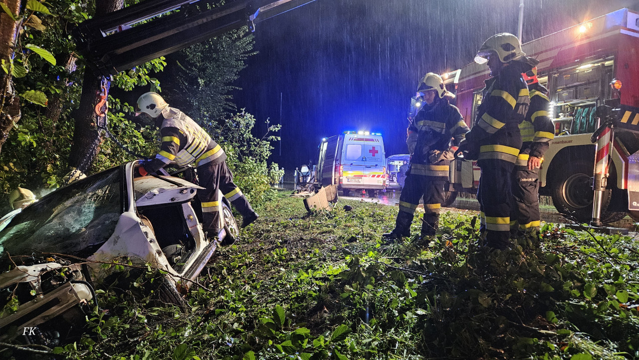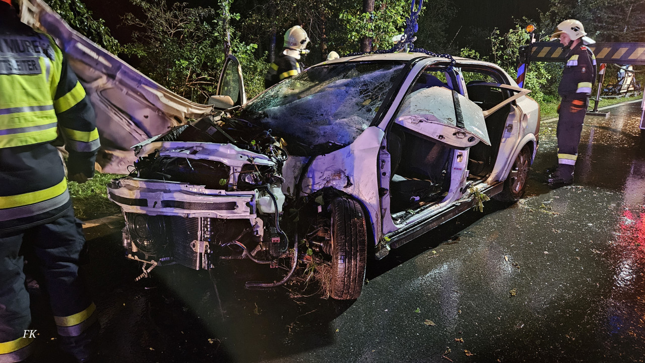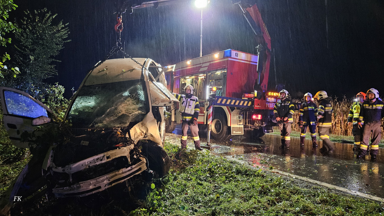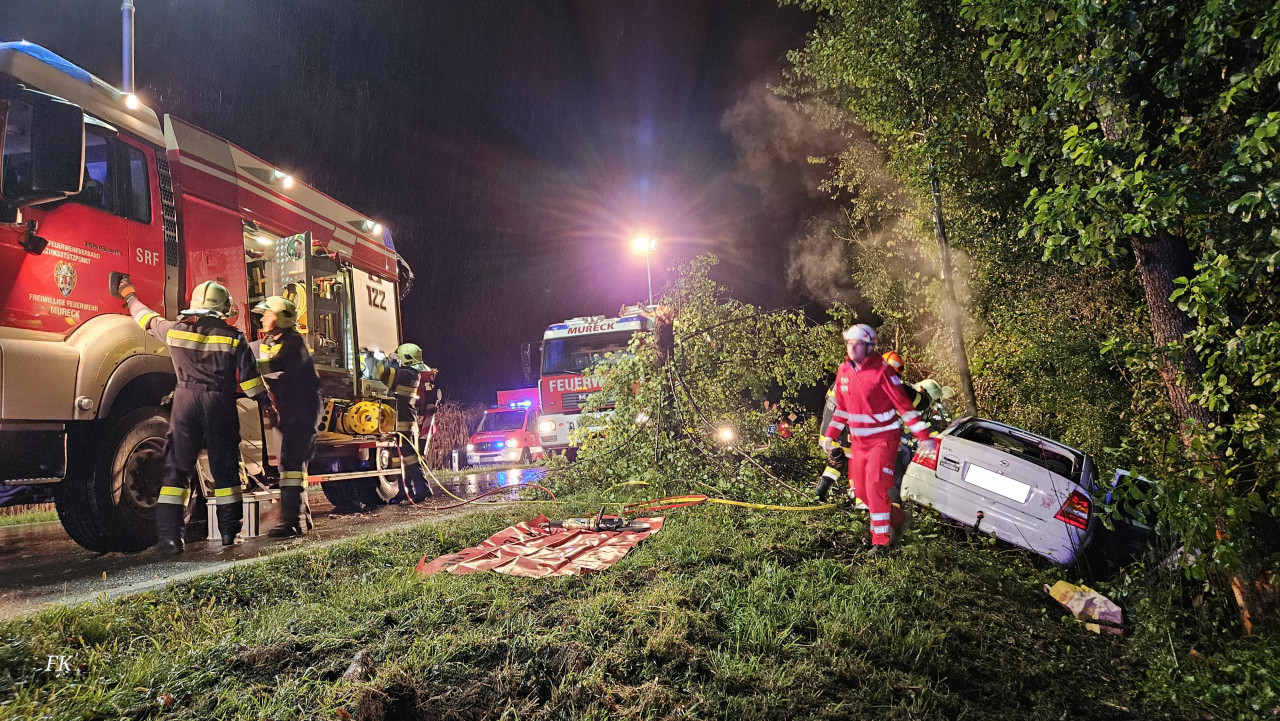 Ein PKW-Lenker fuhr nach 22 Uhr mit seinem Fahrzeug auf der B69 in Richtung Mureck. Vor der westlichen Ortseinfahrt kam er in einer langgezogenen Rechtskurve auf der regennassen Fahrbahn rechts von der Straße ab und prallte gegen einen Baum.
