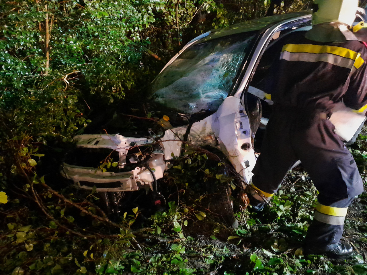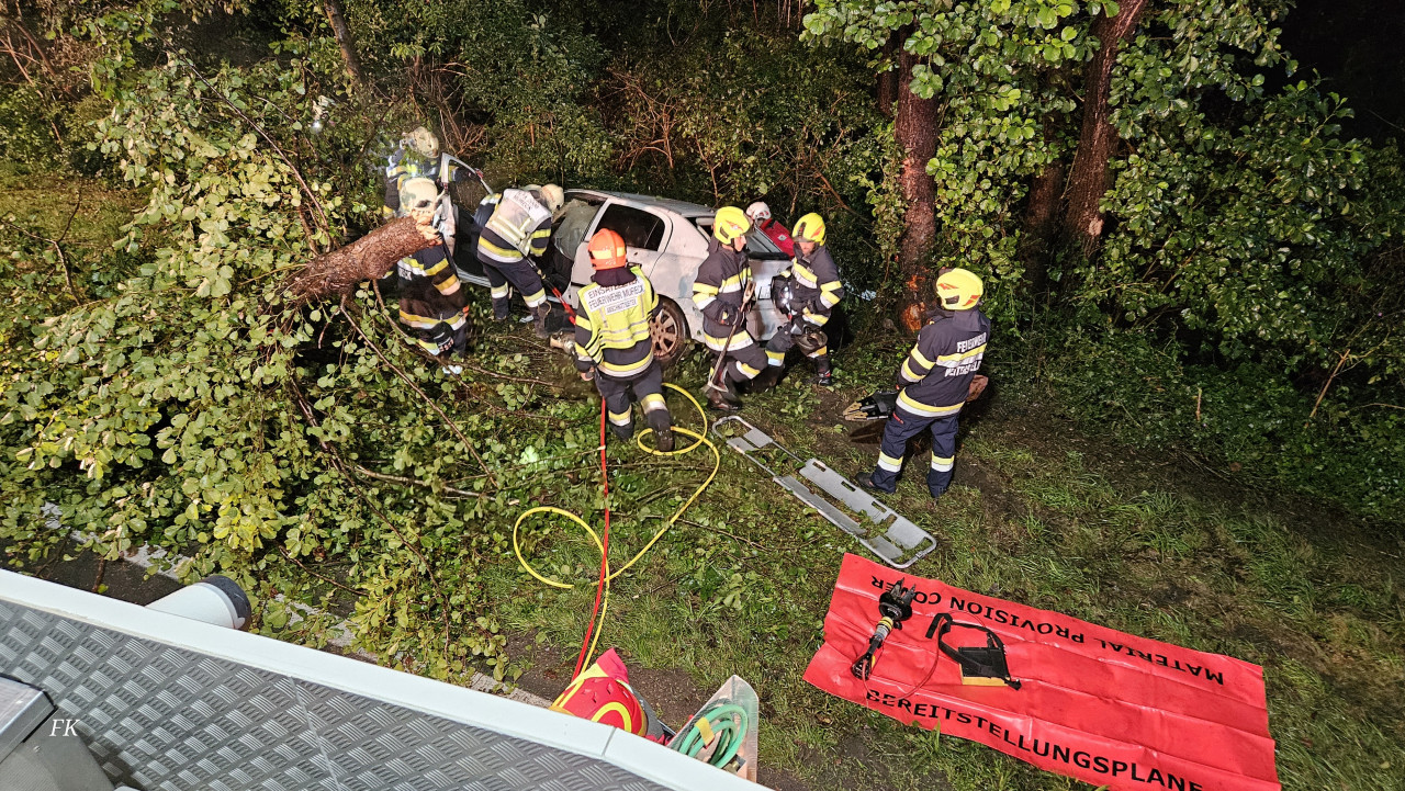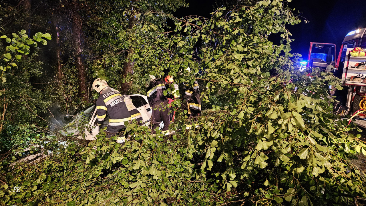 Ein PKW-Lenker fuhr nach 22 Uhr mit seinem Fahrzeug auf der B69 in Richtung Mureck. Vor der westlichen Ortseinfahrt kam er in einer langgezogenen Rechtskurve auf der regennassen Fahrbahn rechts von der Straße ab und prallte gegen einen Baum.