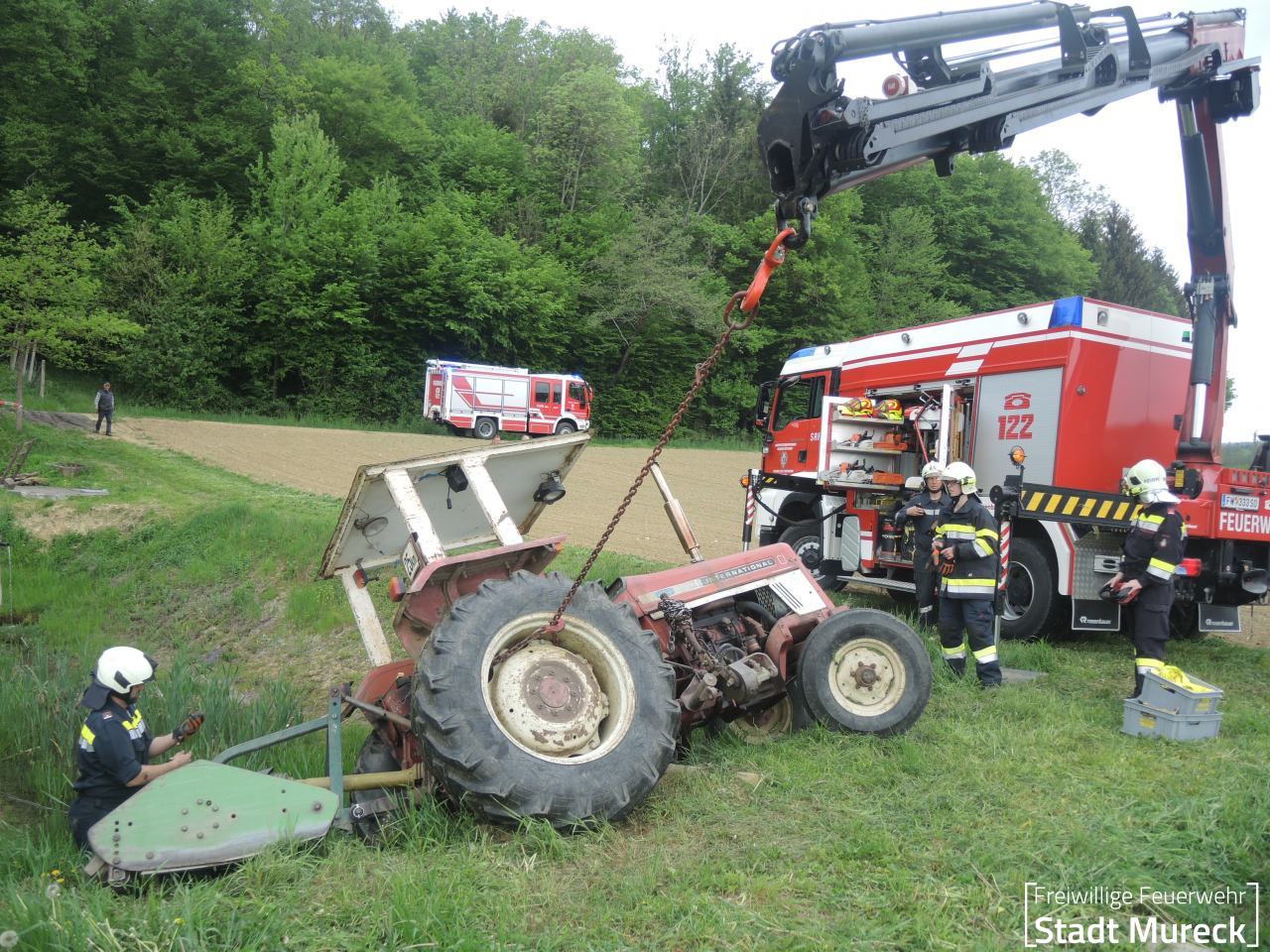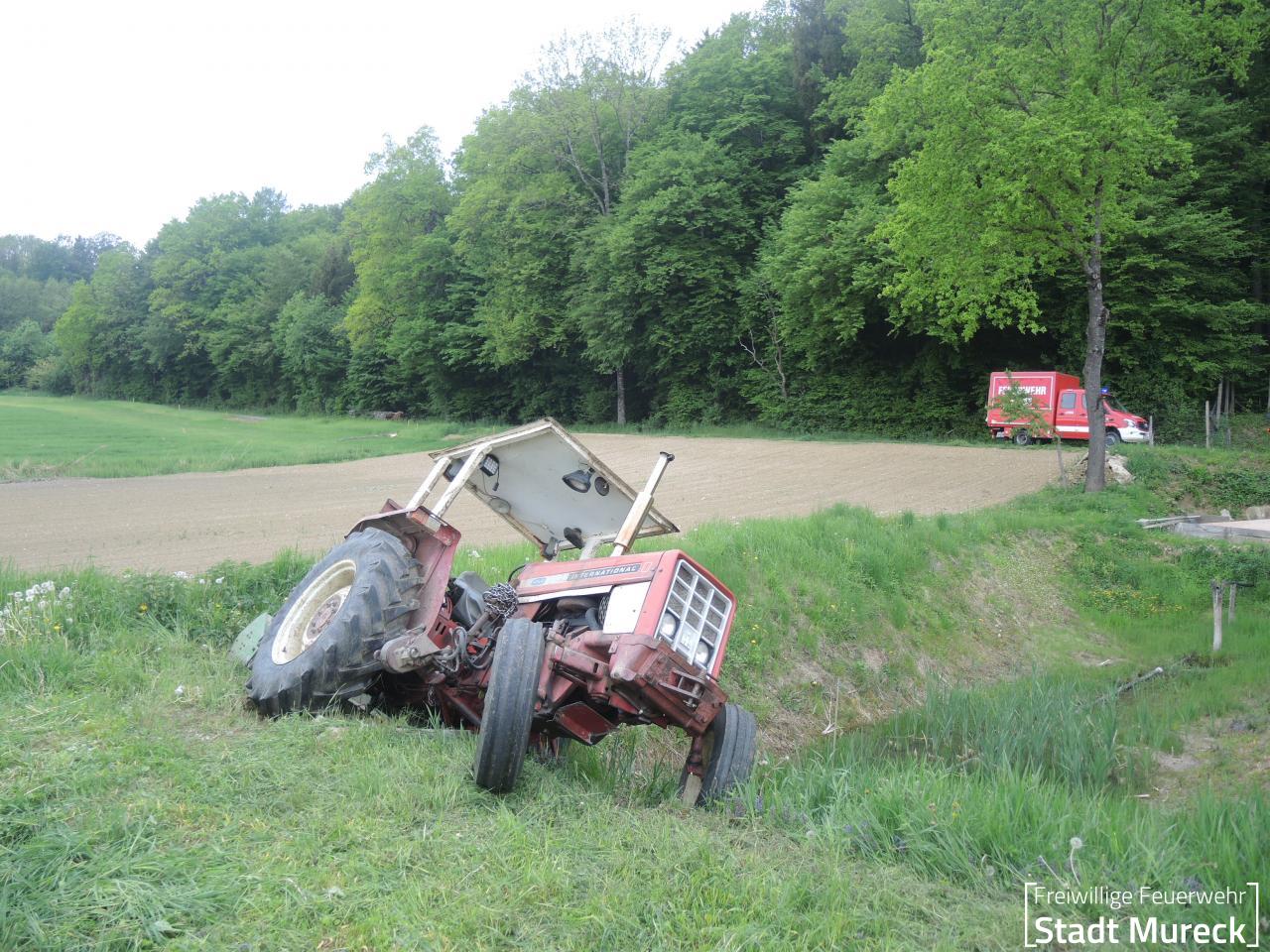 Ein Traktor geriet bei Mäharbeiten in Schräglage und drohte in einen Graben zu stürzen. Der Fahrer konnte noch absteigen und sich in Sicherheit bringen.