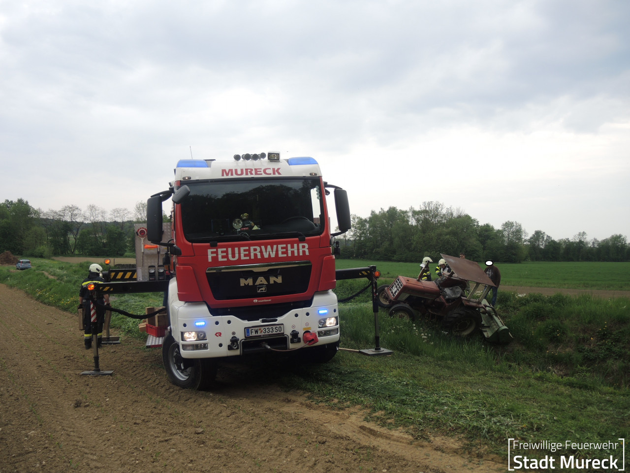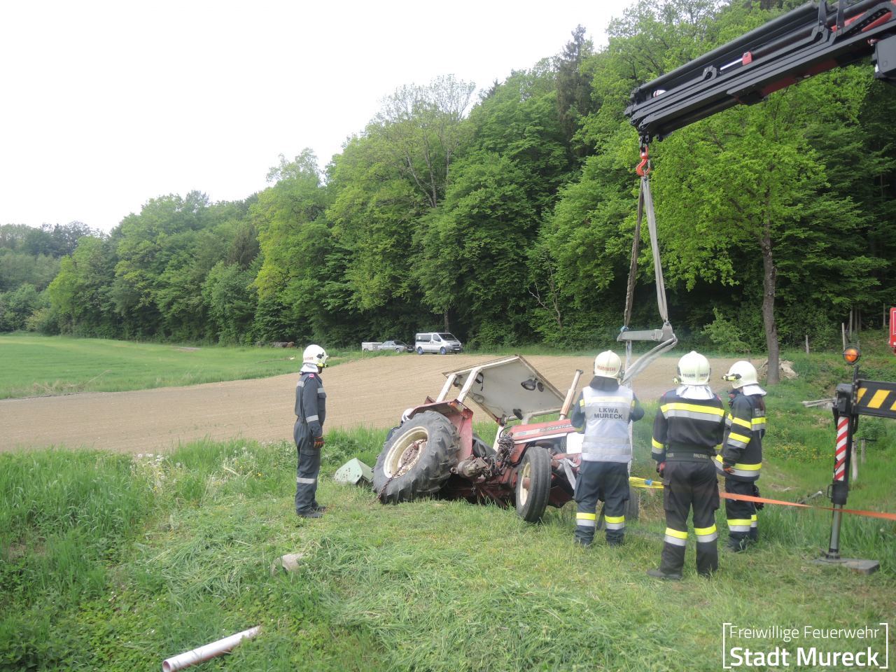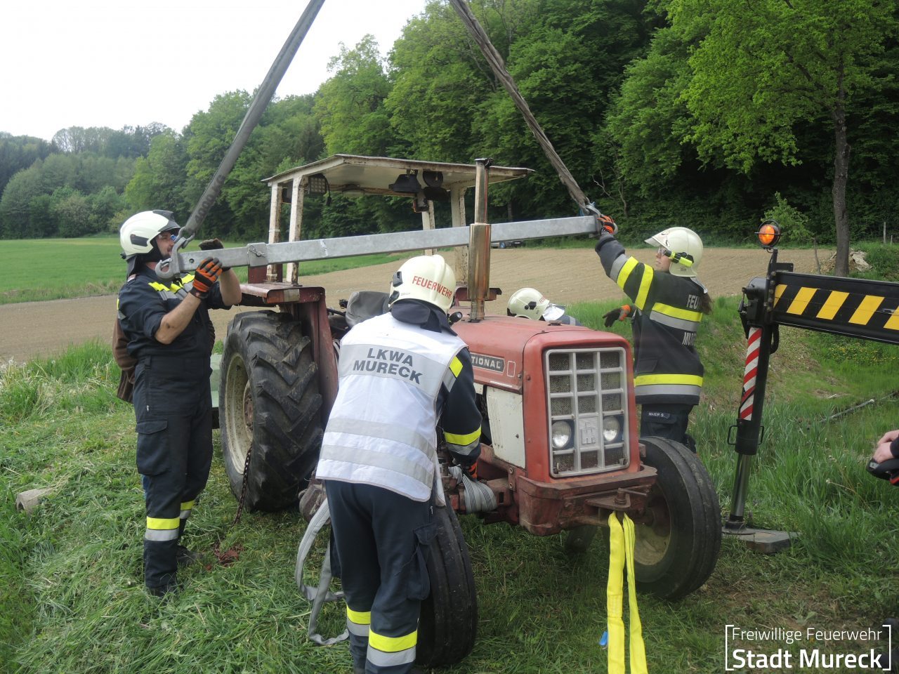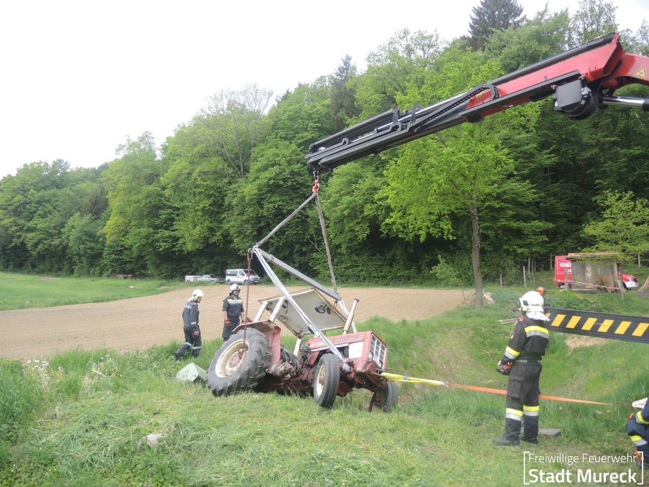 Nach dem Eintreffen am Einsatzort wurde der Traktor vorerst mittels Kettengehänge am Kran gegen weiteres Abrutschen gesichert.