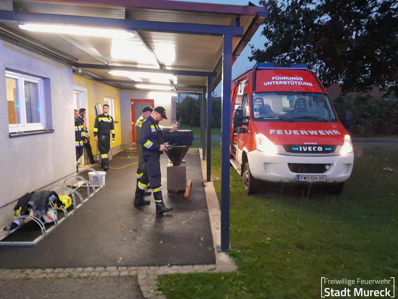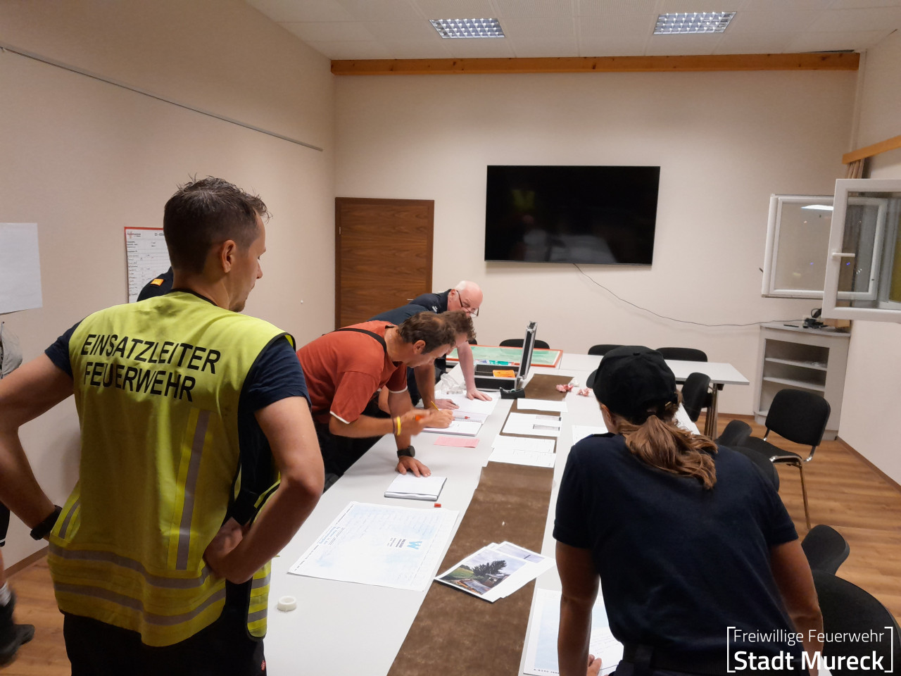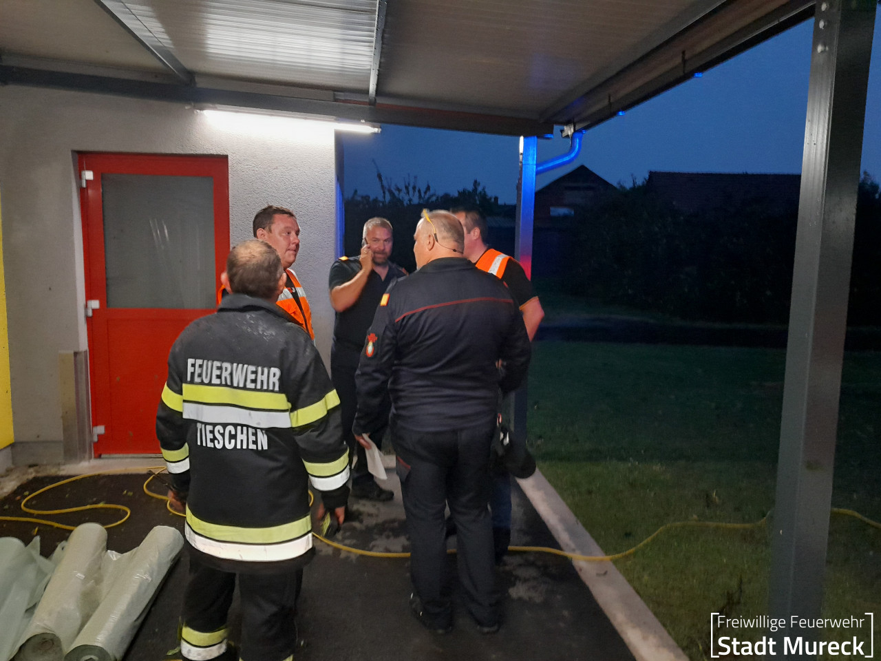Die Feuerwehr Mureck stand mit 17 Personen und 4 Fahrzeugen bis 23.30 Uhr im Einsatz, um die örtlichen Feuerwehrkräfte bei den Aufräumarbeiten zu unterstützen. Ein Mann der FF Mureck unterstützt die Einsatzleitung (Bereichsführungsstab) im Feuerwehrhaus Gosdorf. Bürgermeister Klaus Strein verfolgte das Einsatzgeschehen beim Bereichsführungsstab.