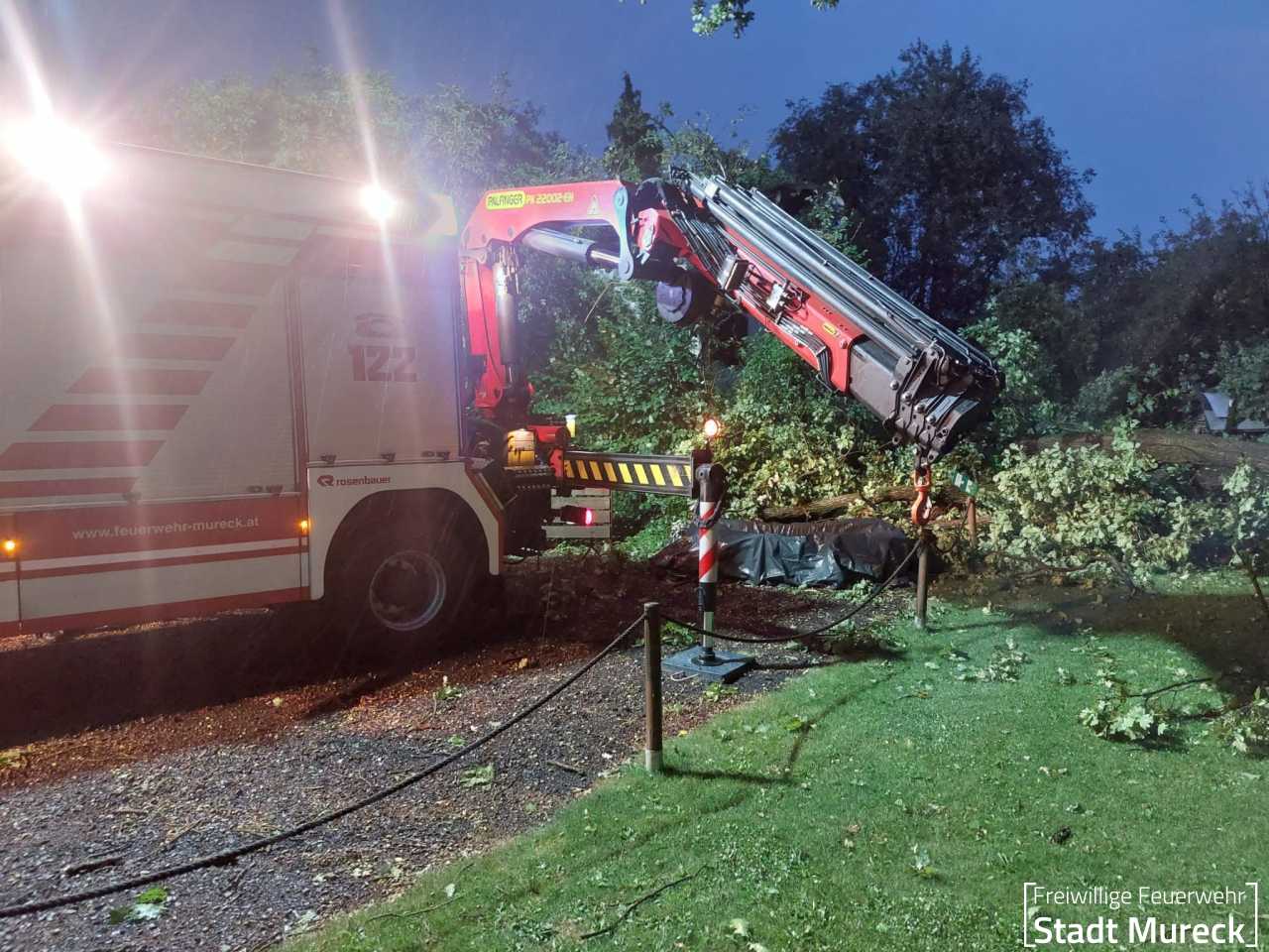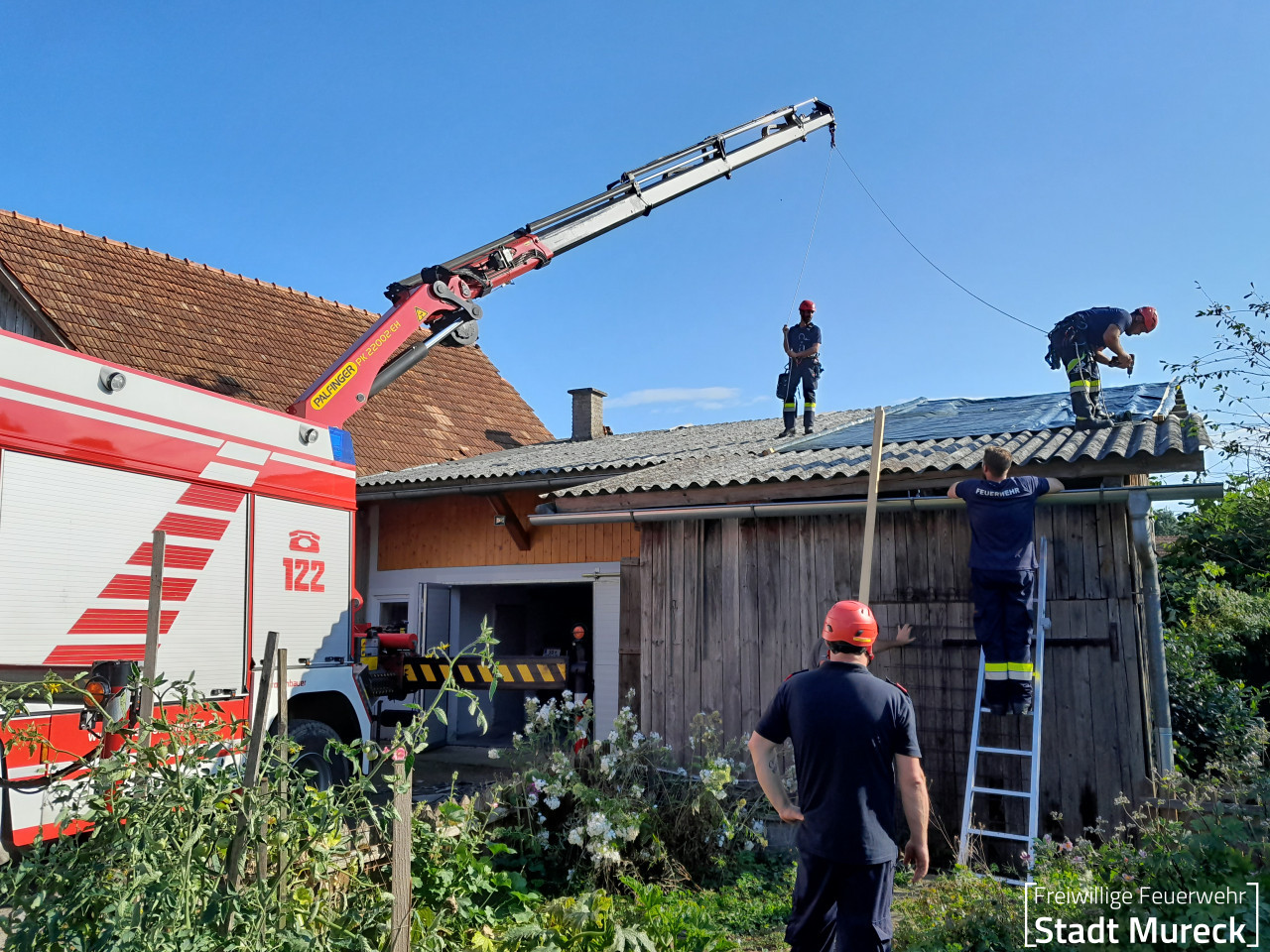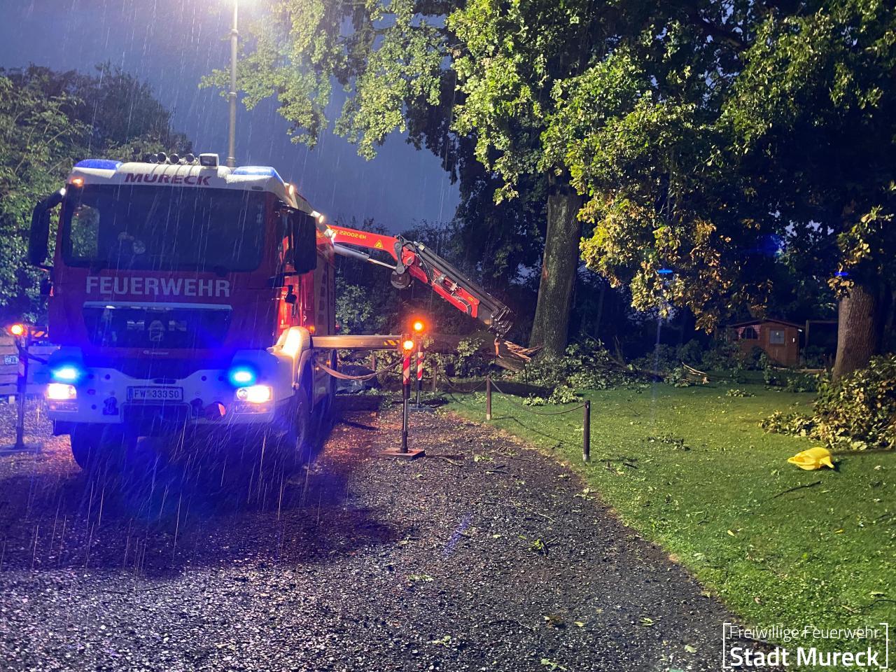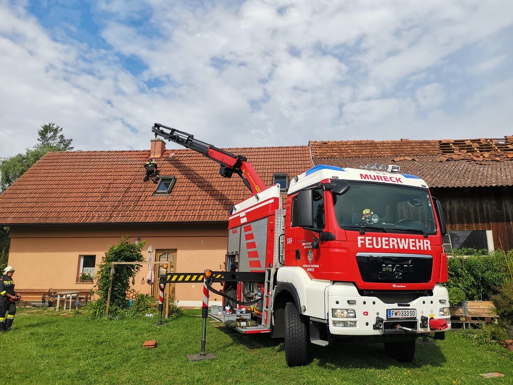ab 08:00 werden die Aufräumarbeiten fortgesetzt, die Feuerwehr Mureck steht mit dem SRF und LKWA mit Korbanhänger und 10 Mann, gemeinsam mit weiteren Feuerwehren aus dem Feuerwehrbereich Radkersburg im Einsatz.