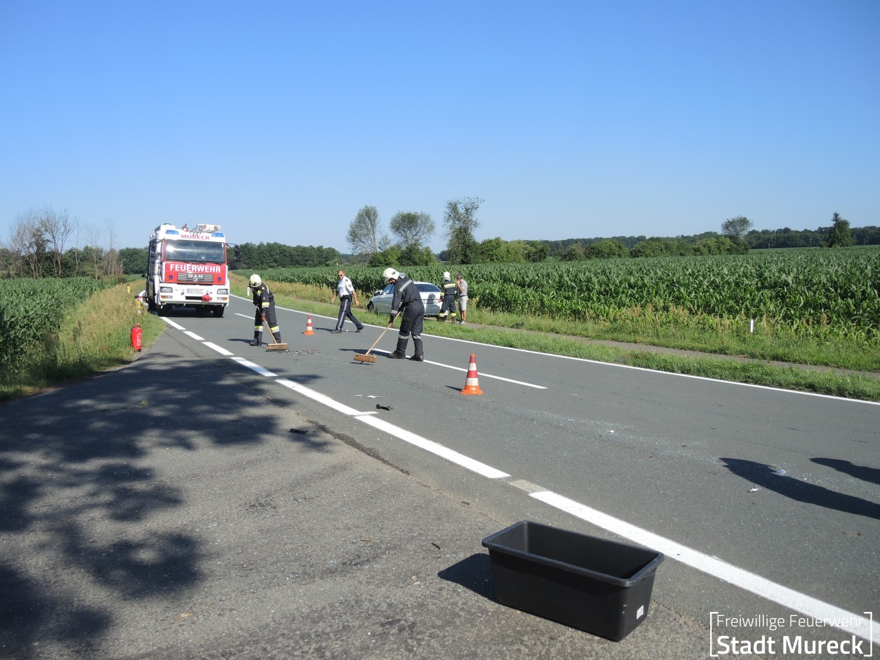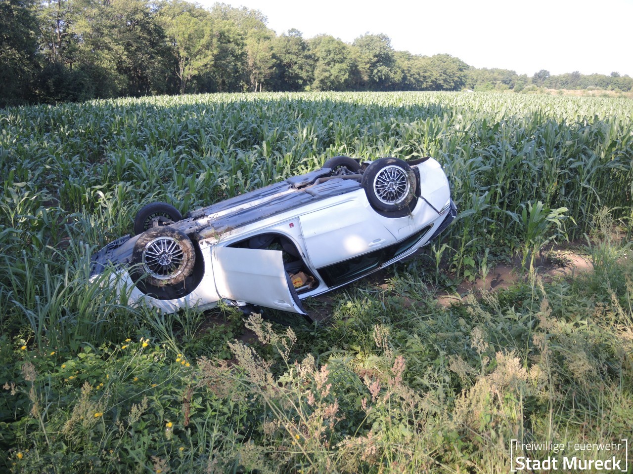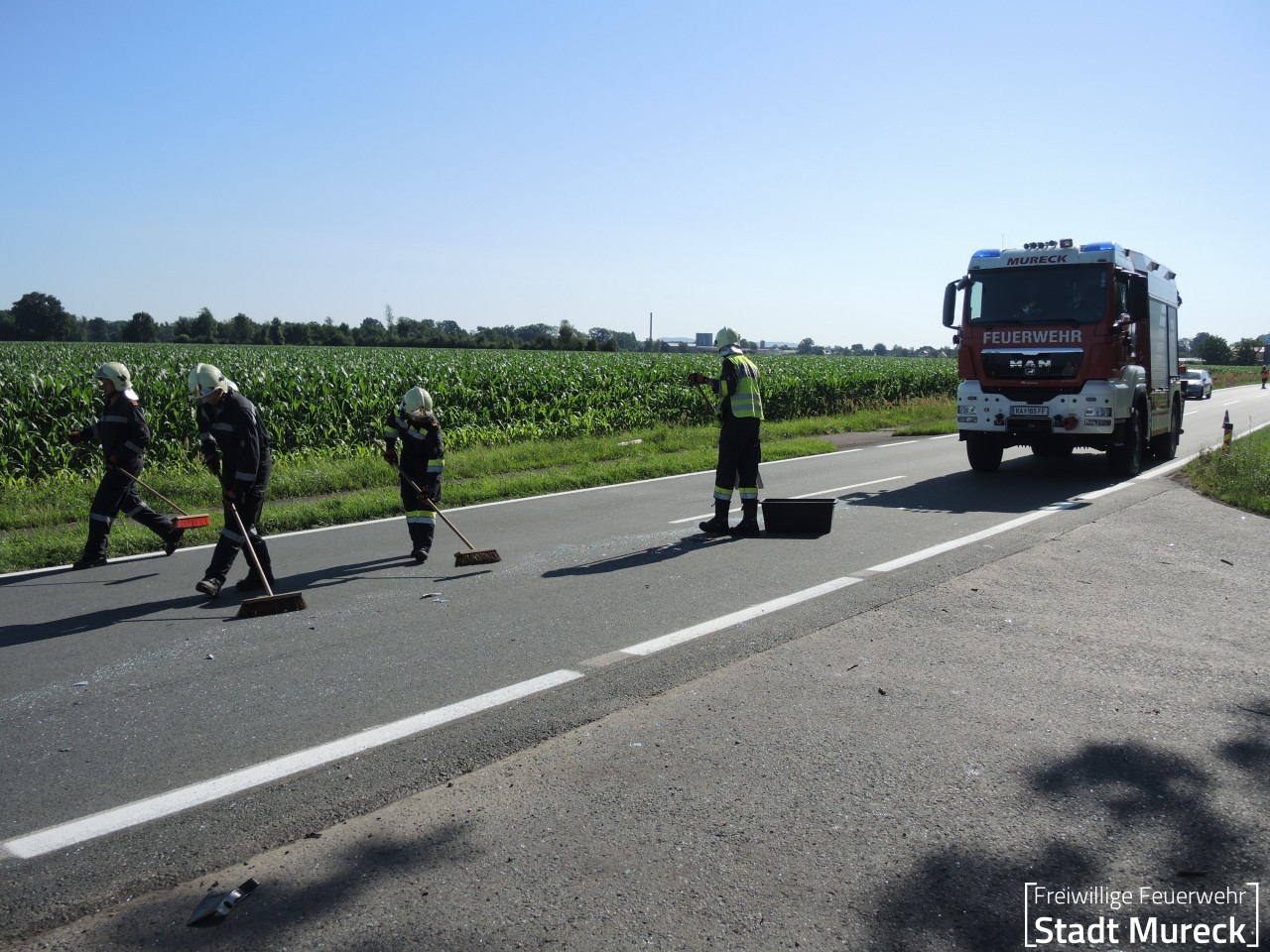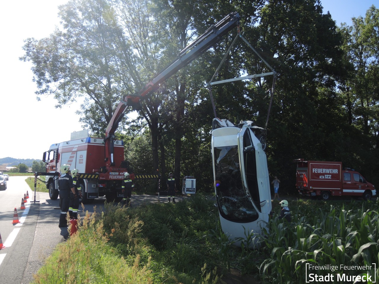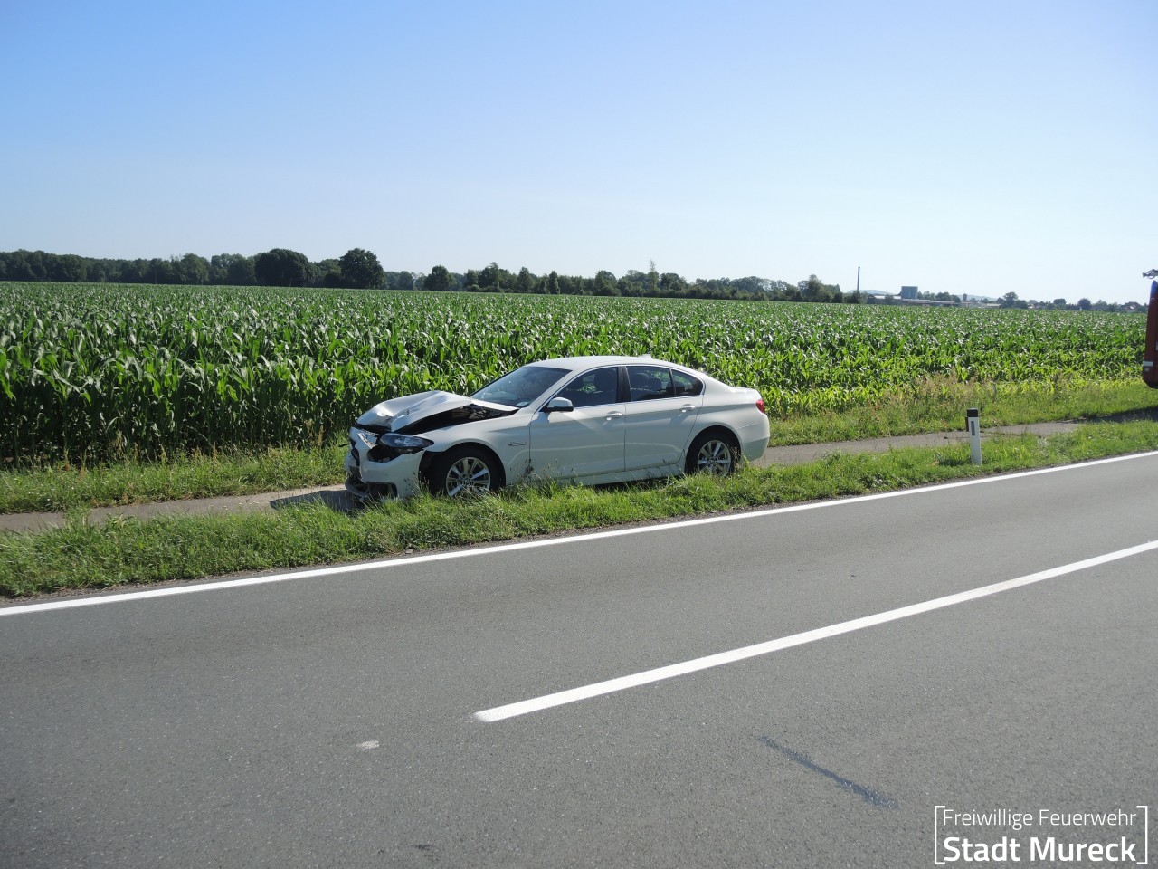 Auf der B69 kurz nach dem Ortsgebiet von Mureck in Richtung Weitersfeld kam es zu einem Verkehrsunfall mit 2 Fahrzeugen. Einer der Lenker übersah einen zum Abbiegen stehengebliebenen PKW und fuhr auf diesen auf. Durch die Wucht des Aufpralls wurde das stehende Fahrzeug in den Acker geschleudert und kam dort auf dem Dach zu liegen.
