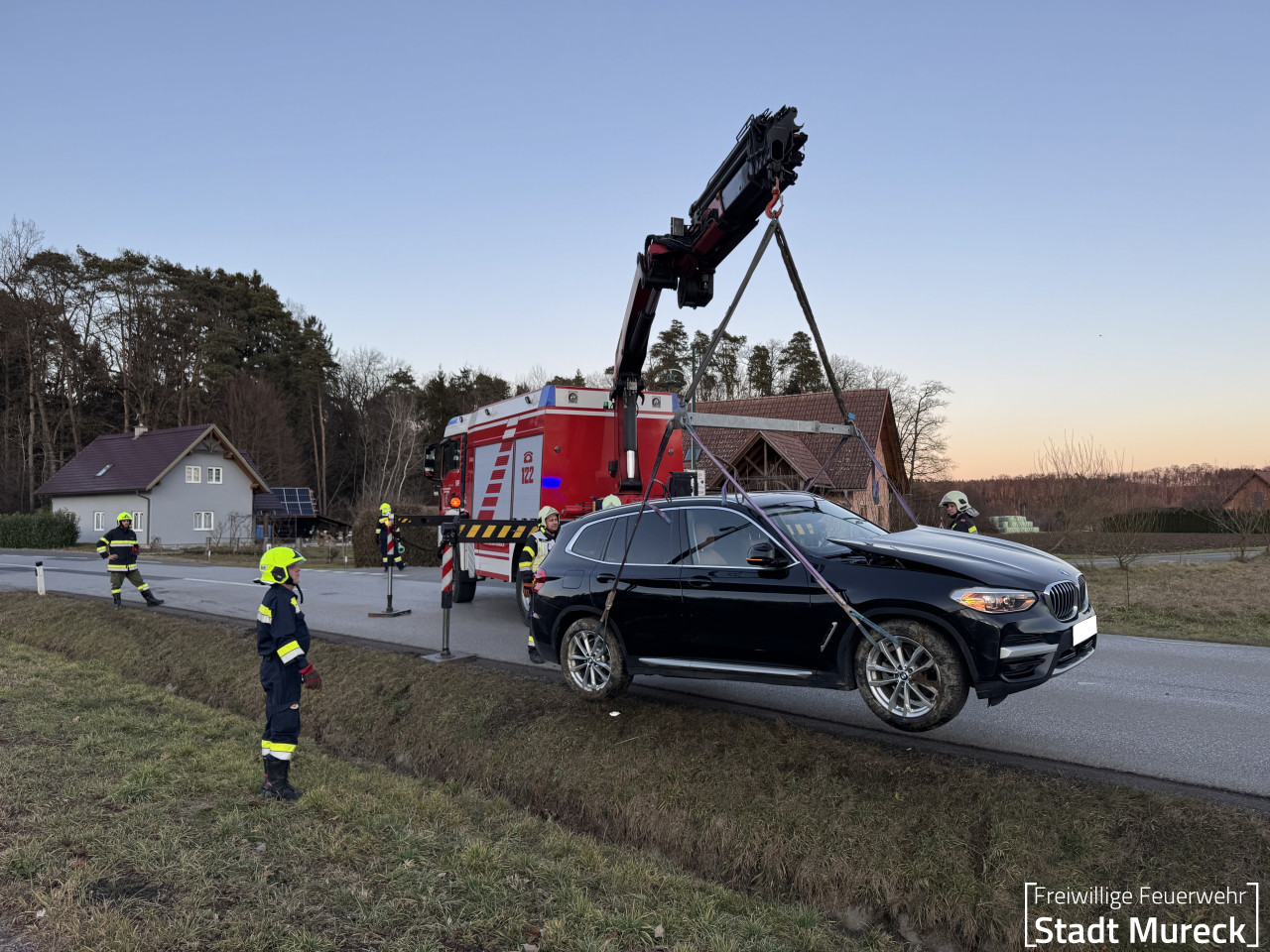 Bergung eines PKW aus dem Straßengraben mittels Kran und Hebetraverse des Schweren Rüstfahrzeuges nach einem Verkehrsunfall mit 3 PKW.