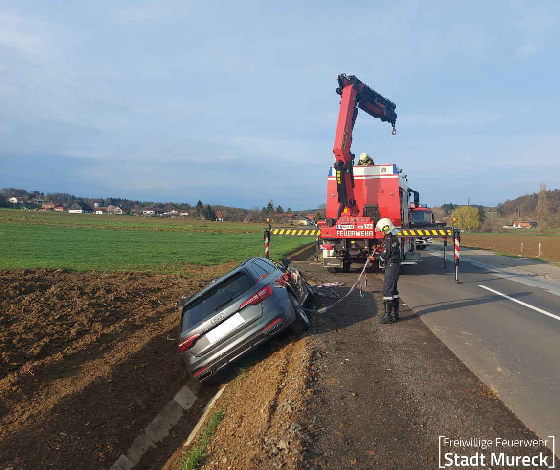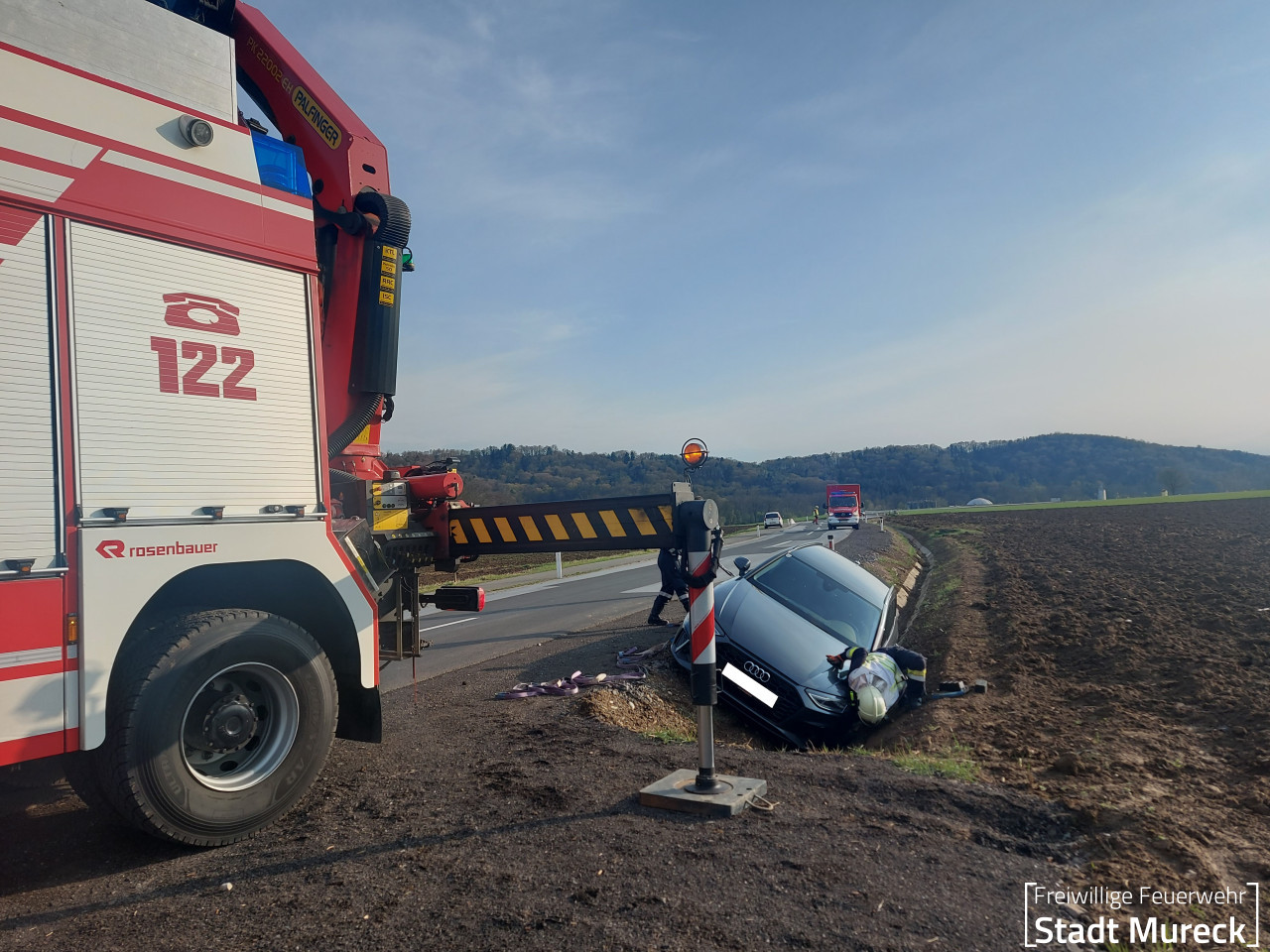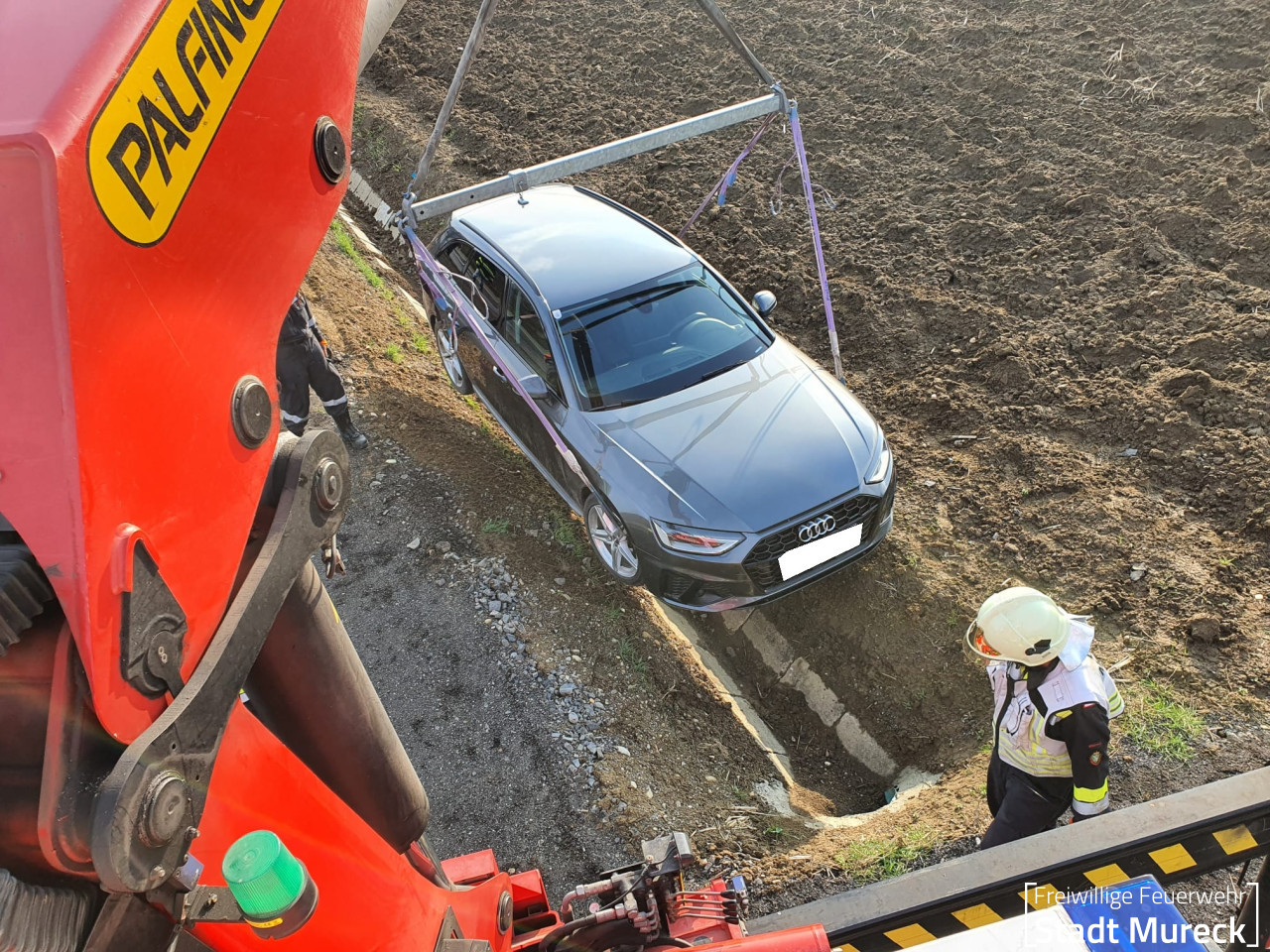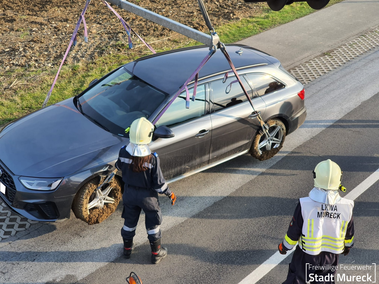 Bergung eines PKW aus dem Straßengraben mittels Kran und Hebetraverse des Schweren Rüstfahrzeuges nach einem Verkehrsunfall.