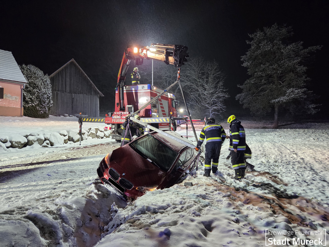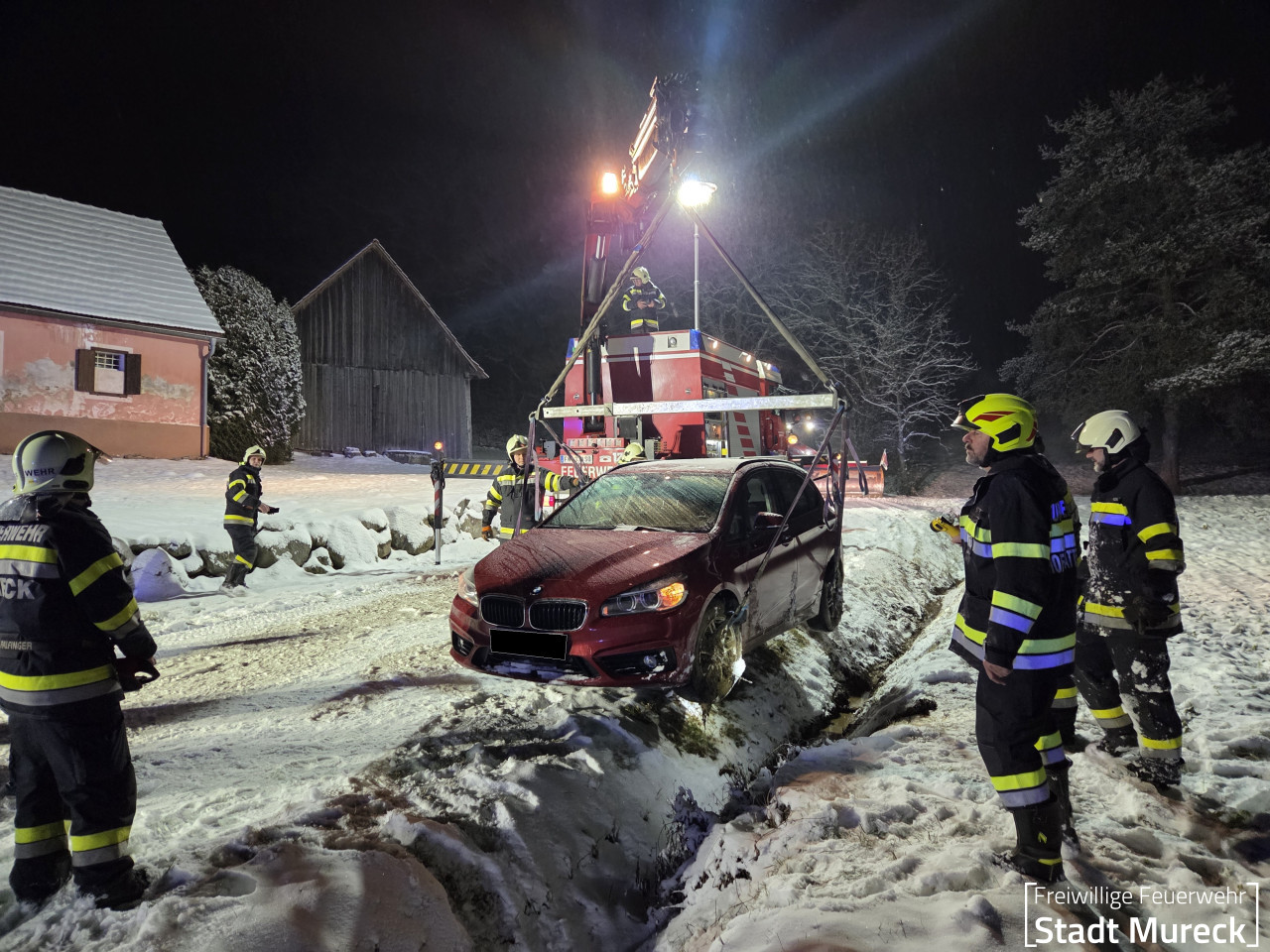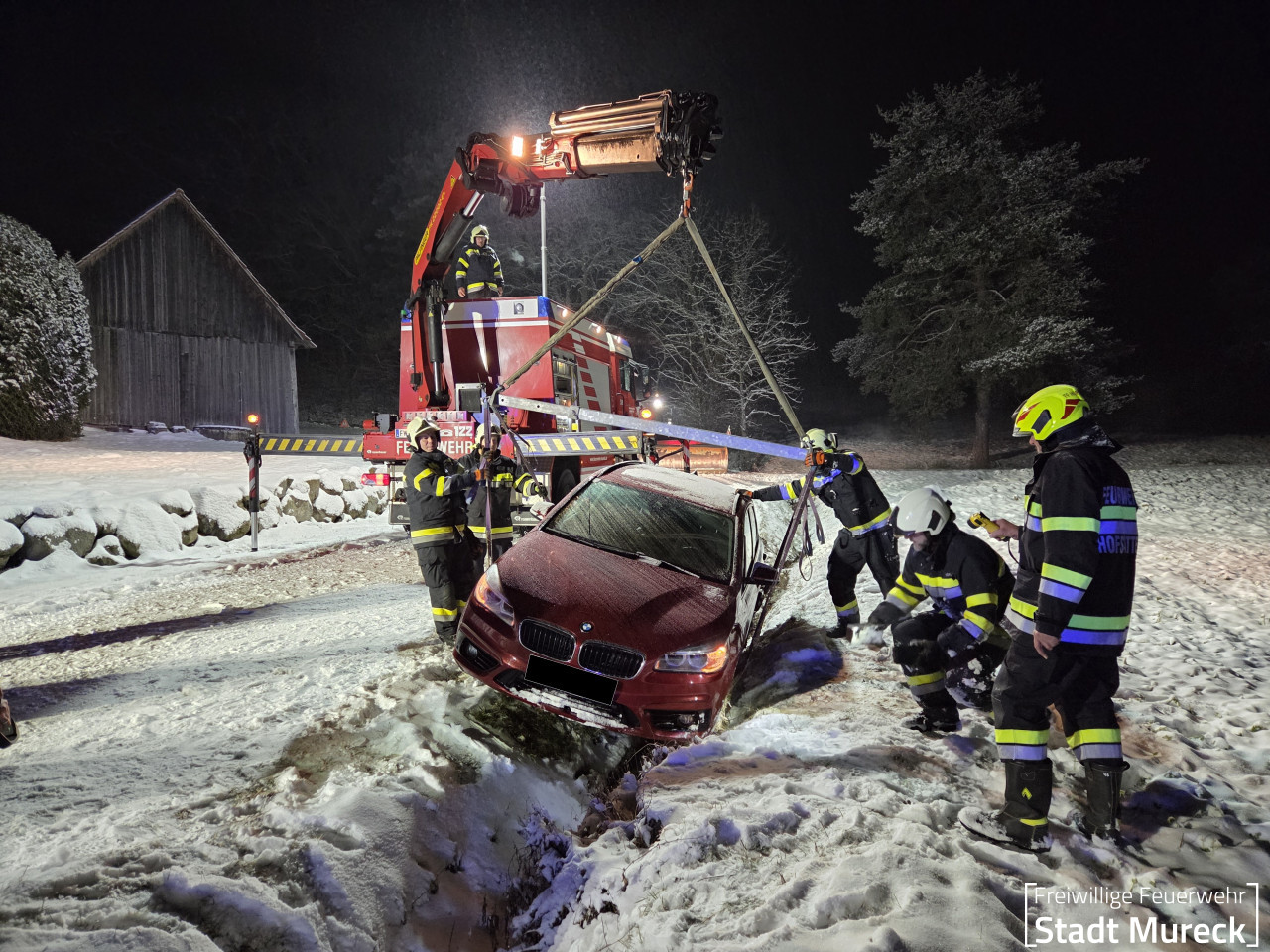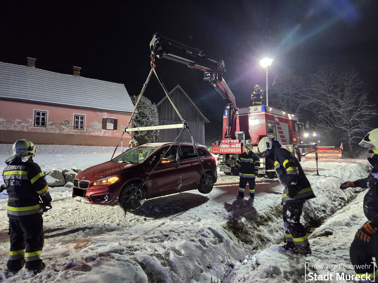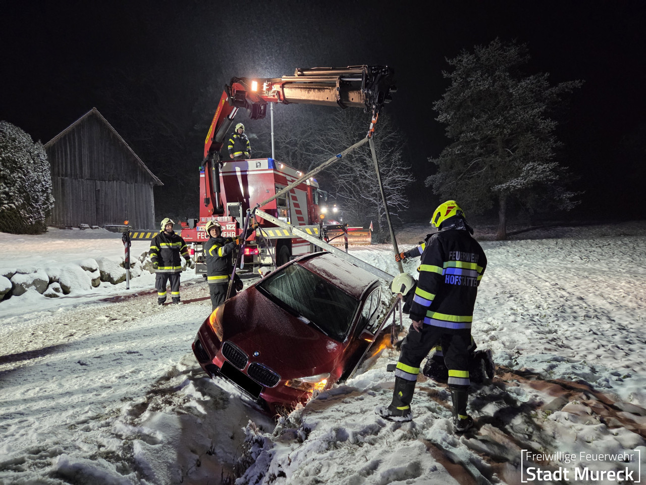Am Abend des 5. Jänner 2026 wurde die Feuerwehr Mureck mit dem Schweren Rüstfahrzeug (Stützpunktfahrzeug für den Feuerwehrbereich Radkersburg) von der einsatzleitenden Feuerwehr Hofstätten zur Unterstützung bei einer Fahrzeugbergung gerufen.