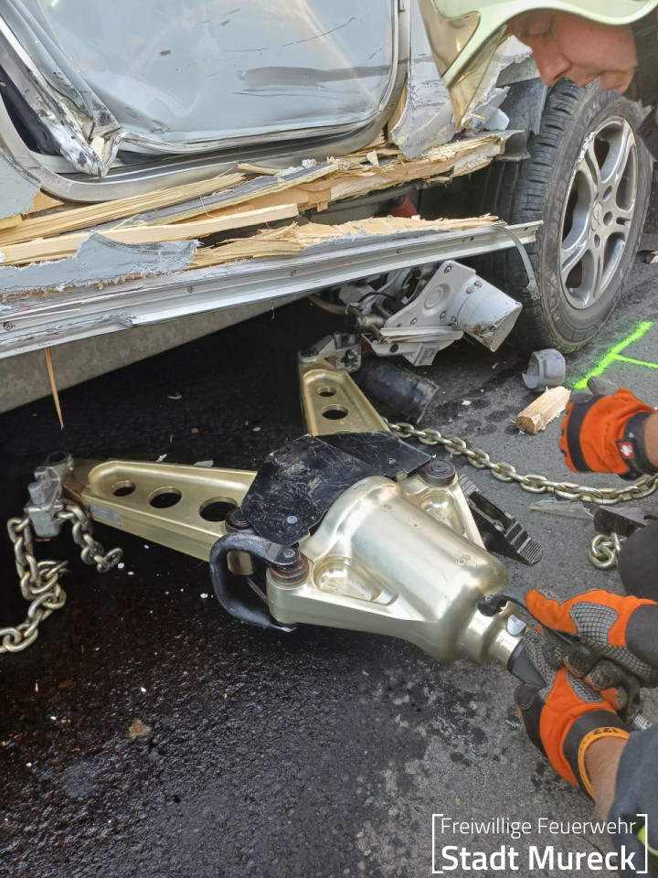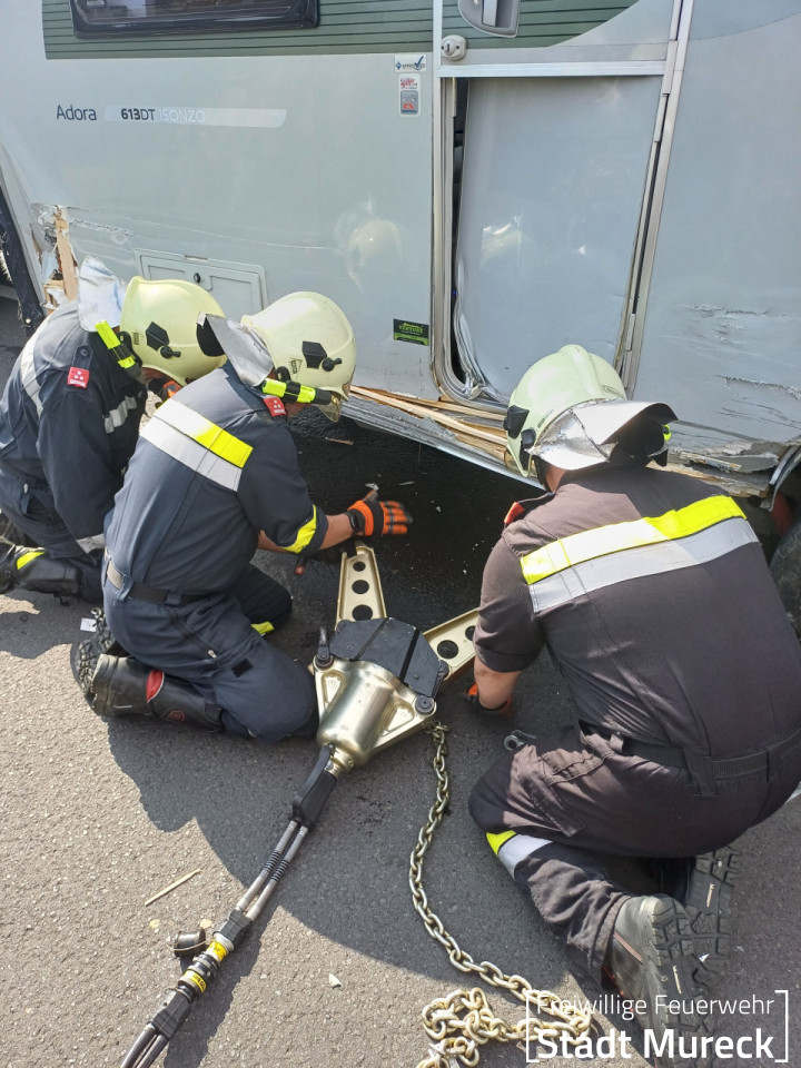 Der Wohnwagen wurde von der Feuerwehr Mureck mittels hydraulischem Spreizer wieder fahrbereit gemacht.