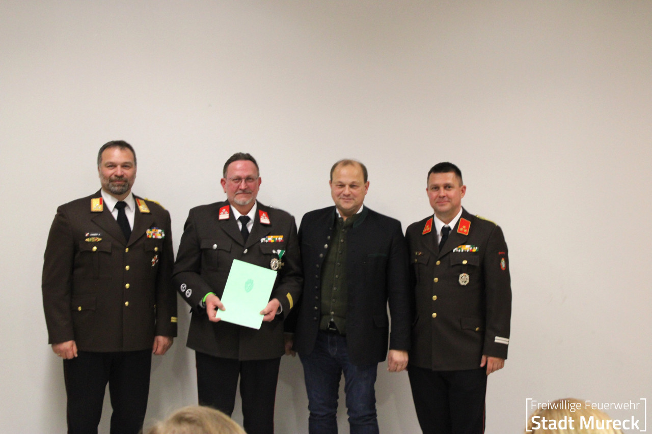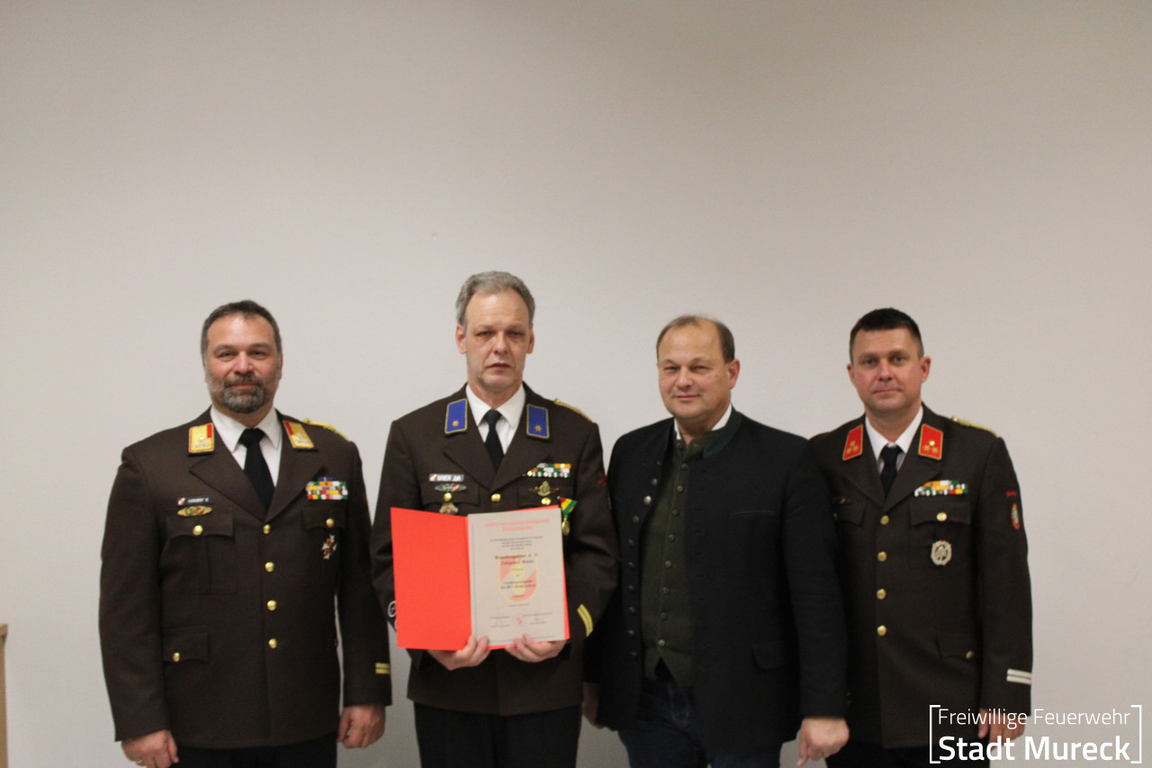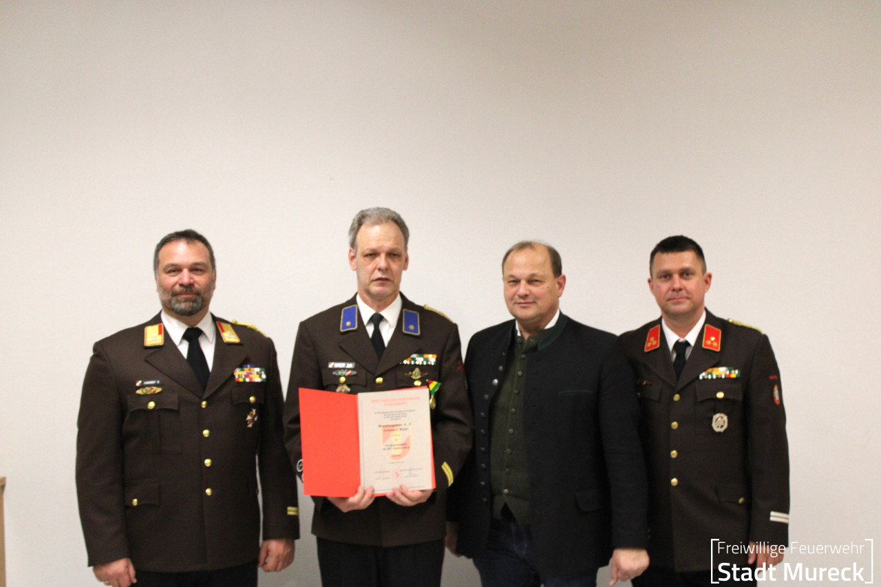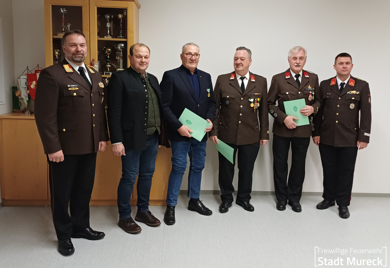 Im Rahmen der Wehrversammlung wurden von Bgm. Klaus Strein Auszeichnungen des Landes Steiermark und von OBR Volker Hanny Auszeichnungen der Landesfeuerwehrverbände Steiermark und Niederösterreich an langjährige und verdiente Mitglieder der FF Mureck überreicht: