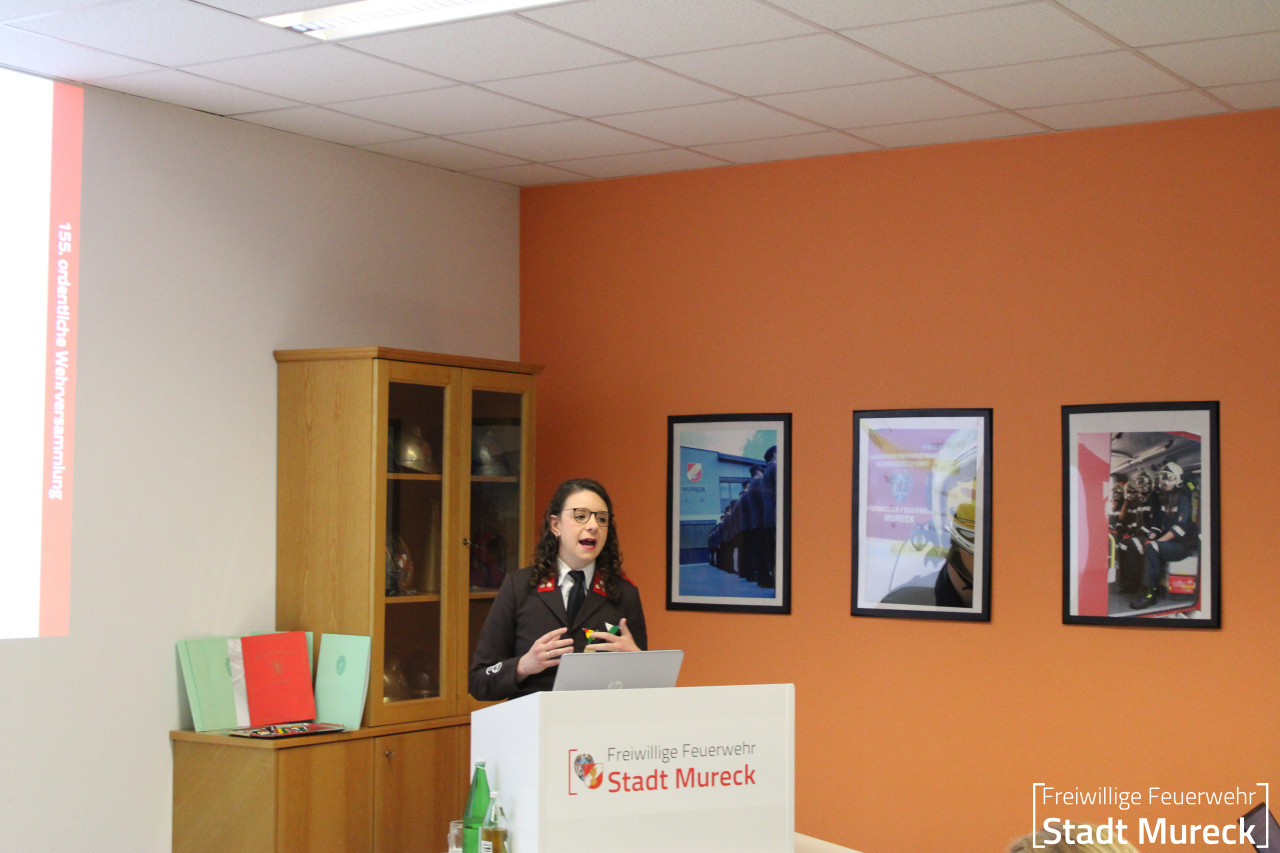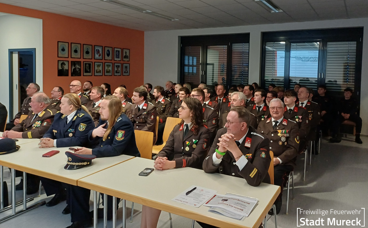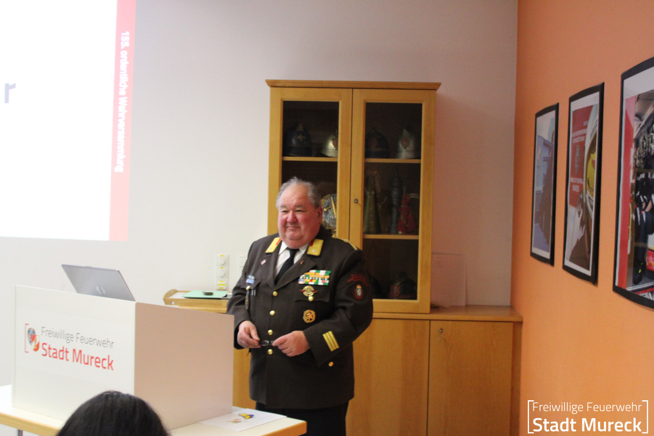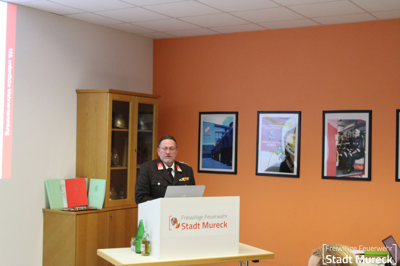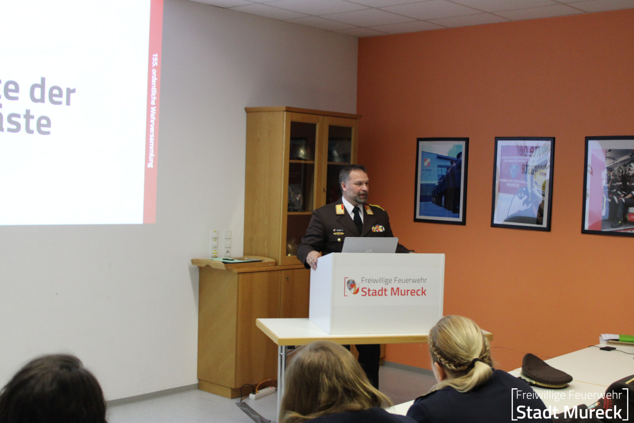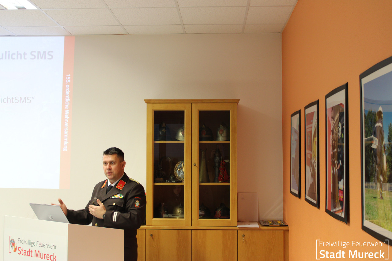 Zur 155. Ordentlichen Wehrversammlung am 10. Jänner 2026 konnte Feuerwehrkommandant HBI Alexander Amschl im Schulungsraum des Feuerwehrhauses 39 stimmberechtigte Mitglieder, 11 Angehörige der Feuerwehrjugend, sowie als Ehrengäste den Bürgermeister der Stadtgemeinde Mureck Klaus Strein, Bereichsfeuerwehrkommandant OBR Volker Hanny, den zuständigen Abschnittsfeuerwehrkommandanten ABI Gottfried Haas und von der PGD Paloma Sladki Vrh (SLO) Präsidentin Valentina Oslovnik.