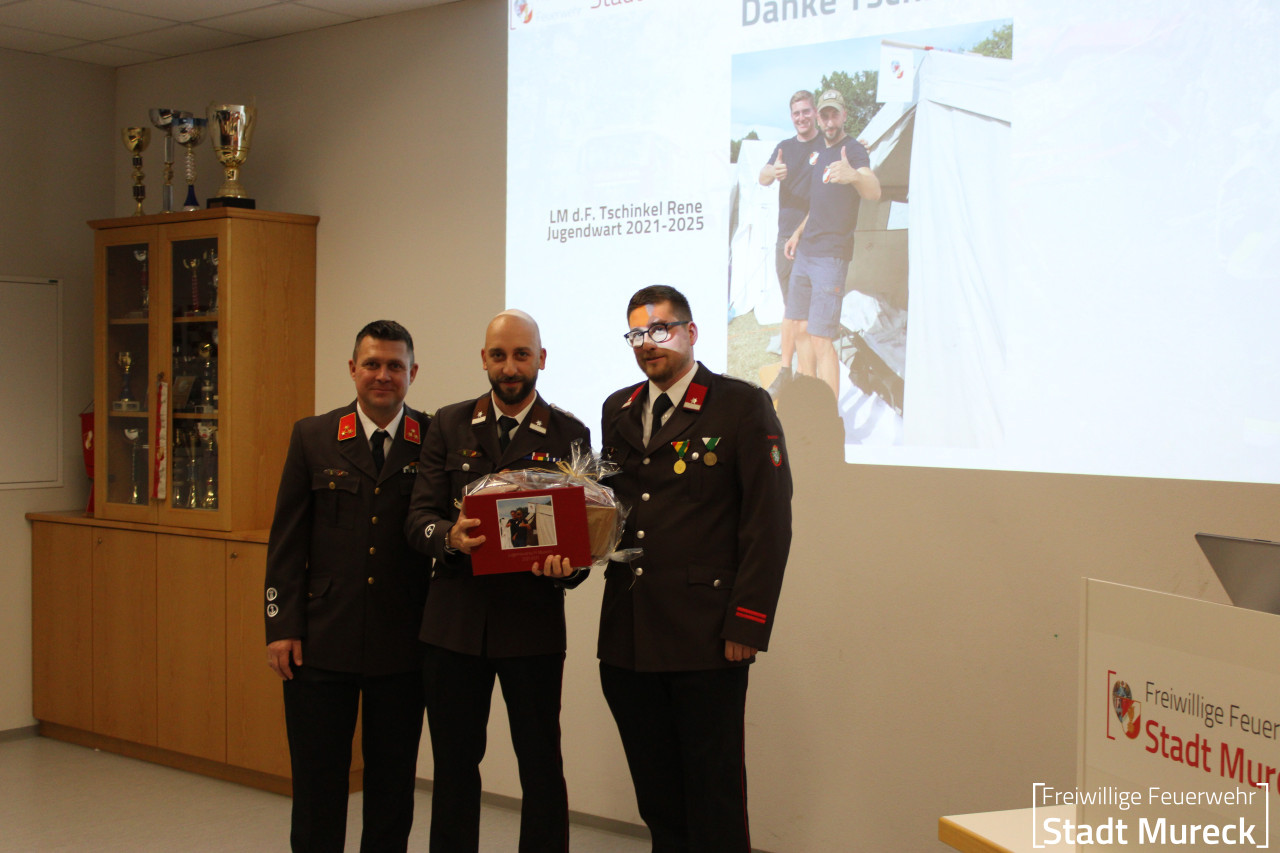 LM d. F. Rene Tschinkel legte seine Funktion als Feuerwehrjugend-Betreuer zurück. Der Ortsjugendbeauftragte LM Matthias Eisner überreichte ihm als Erinnerung an seine vielfältige Tätigkeit ein selbst gestaltetes Fotobuch über die gemeinsame Zeit mit der Feuerwehrjugend. HBI Alexander Amschl stellte sich noch mit einem Geschenkskorb ein.