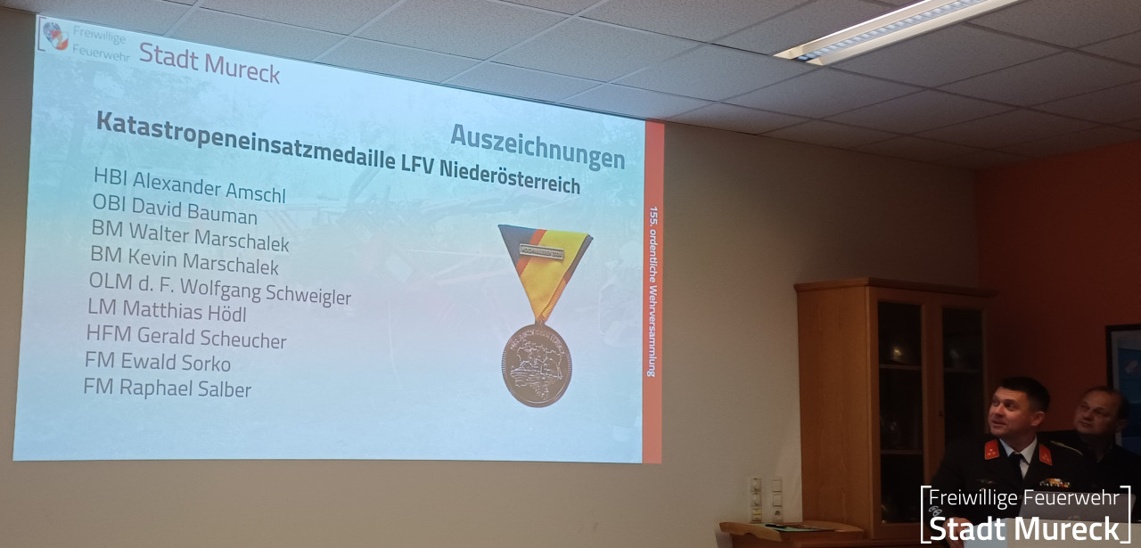 Ein besonderer Moment war die Verleihung der Katastropheneinsatzmedaille des Niederösterreichischen Landesfeuerwehrverbandes an jene Feuerwehrkameraden, die im September 2024 in Spielberg-Pielach (Stadtgemeinde Melk) im Einsatz gestanden sind: HBI Alexander Amschl, OBI David Bauman, BM Walter Marschalek, BM Kevin Marschalek, OLM d. F. Wolfgang Schweigler, LM Matthias Hödl, HFM Gerald Scheucher, FM Raphael Salber und FM Ewald Sorko.