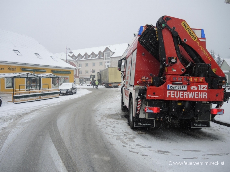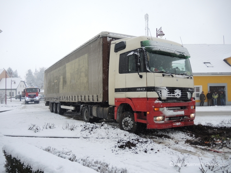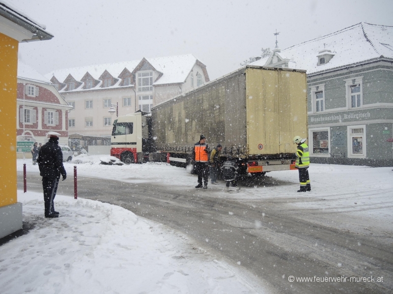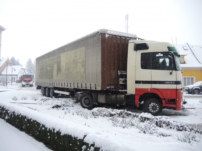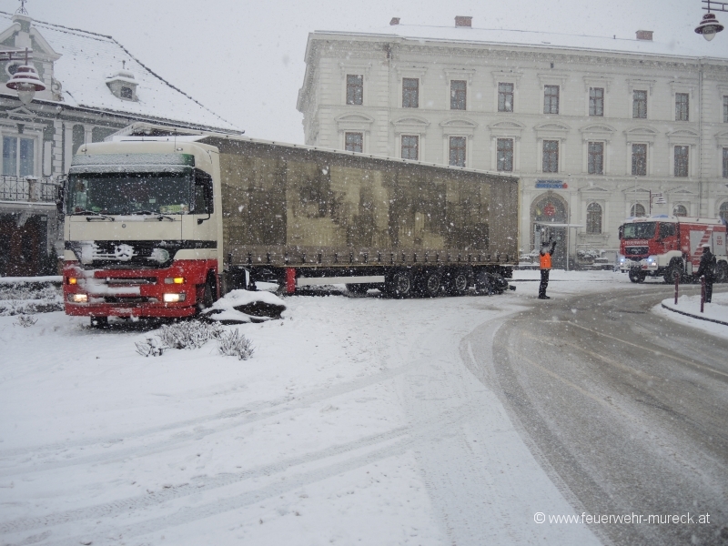 Am Freitagvormittag kam ein Sattelzug auf schneeglatter Fahrbahn am Hauptplatz Mureck ins Rutschen und auf einer Grünanlage zum Stillstand.